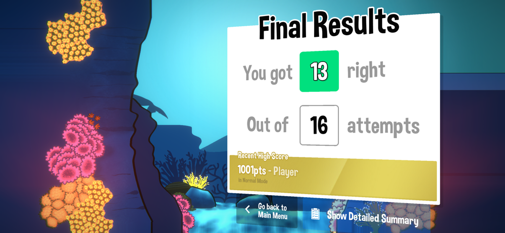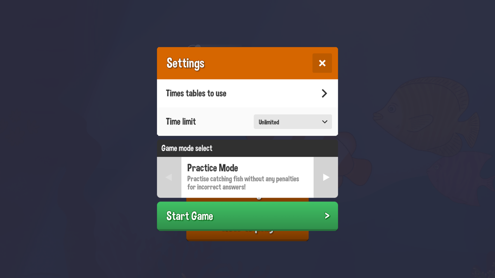 In Practice Mode, children can get to grips with the game, and practise their multiples recognition by simply selecting the fish with the correct number. There are no lives in this game mode, so if a child selects the wrong number there is no early end, the game will only end when the time limit runs out.