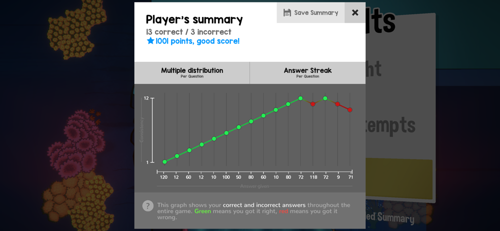 At the end of each game, you can choose to see a detailed summary of the run which will have information presented in a range of graphs allowing you to track the speed of recall and will highlight any particularly troublesome multiples for the child playing.