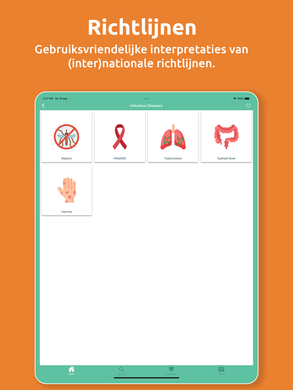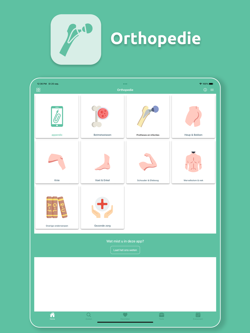 De app 'Orthopedie' is bestemd voor alle zorgverleners die betrokken zijn bij de zorg voor patiënten binnen de orthopedie en aanverwante specialismen, waaronder Sportgeneeskunde en fysiotherapie. Deze app bevat interpretaties van richtlijnen, inclusief interactieve flow-charts en handige calculators, die ook als ‘favoriet’ opgeslagen kunnen worden.