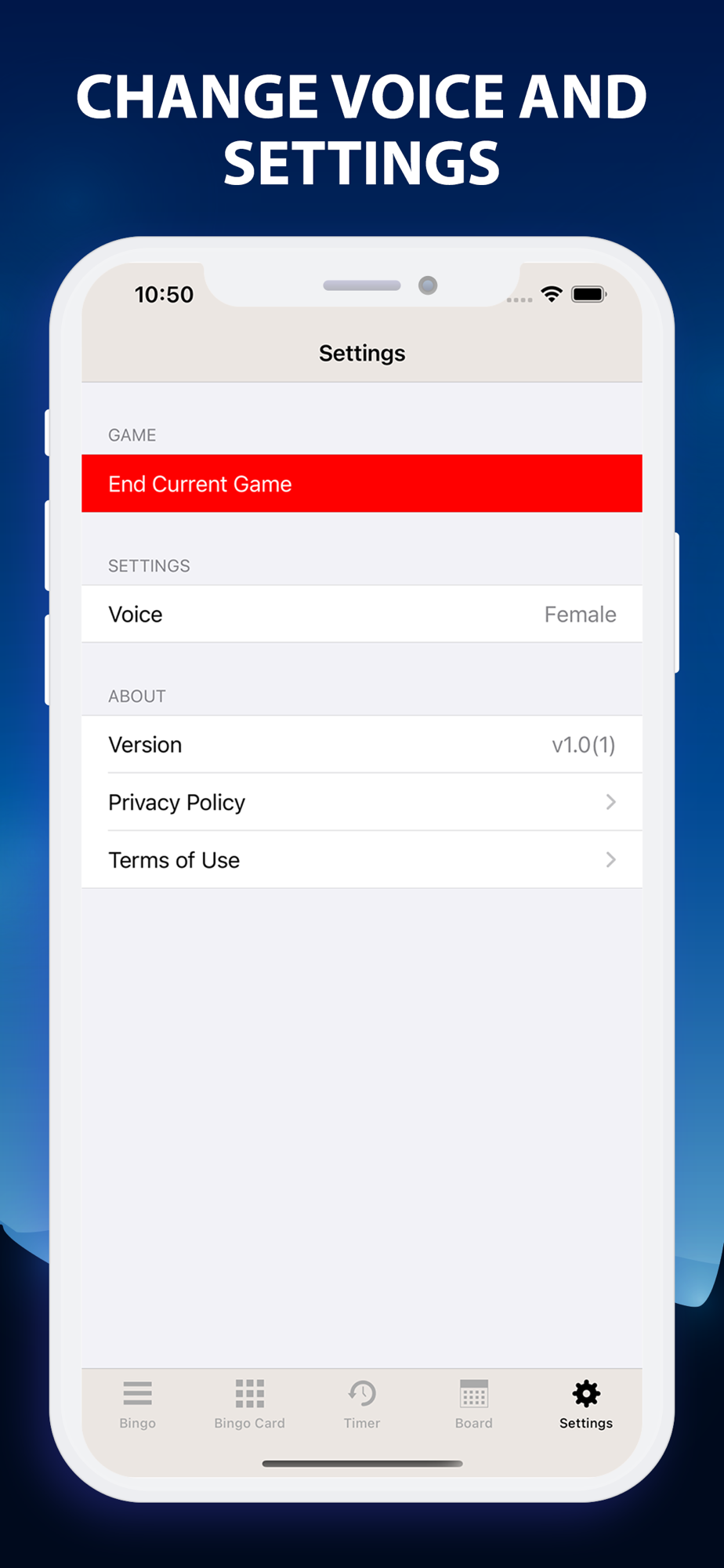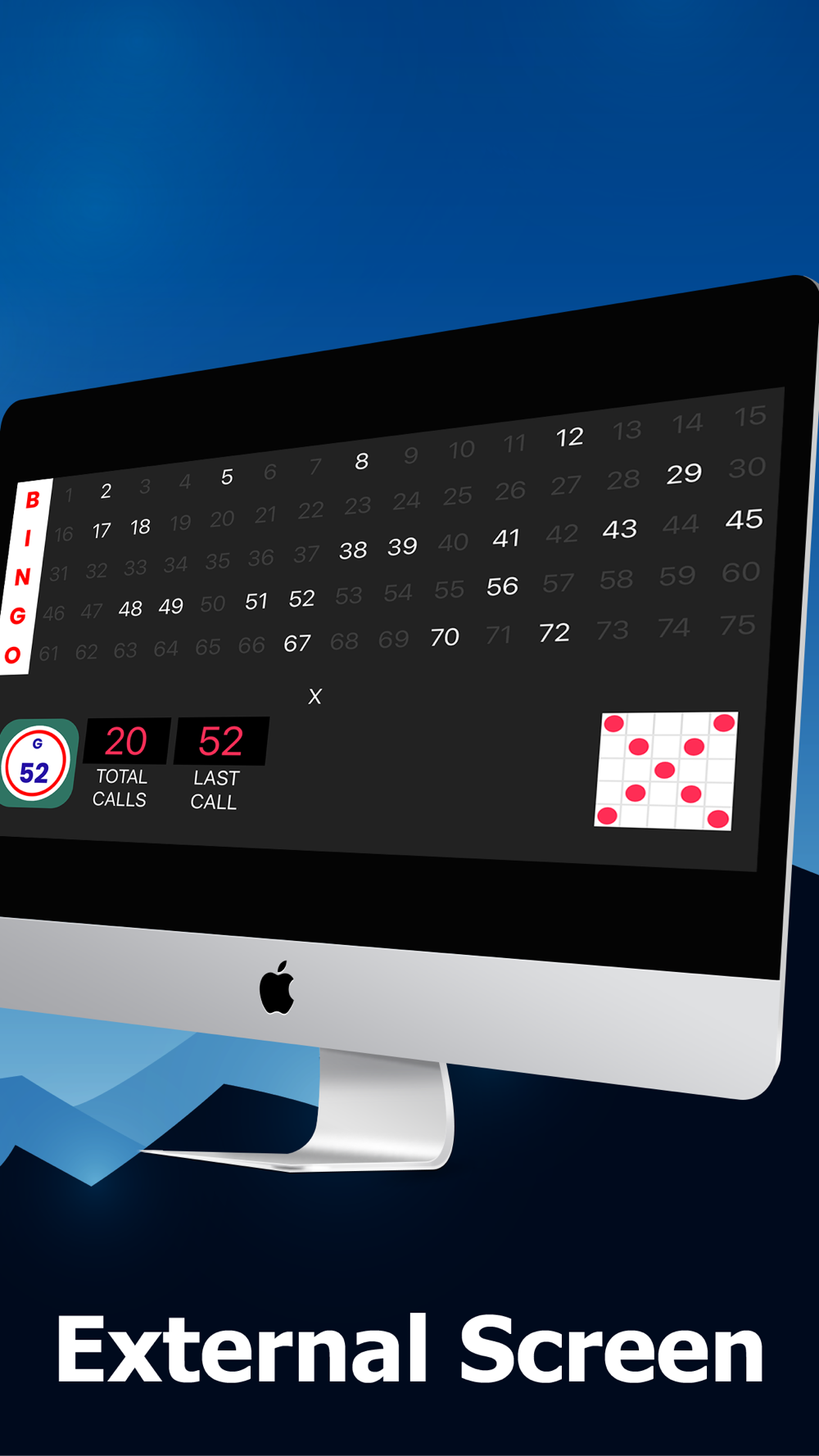 Bingo Caller has a feature to display to an external display or screen. All you have to do is turn on the Air Play / Apple Screen Mirroring feature and Bingo Caller will display the called numbers to that screen. Bingo caller also features the ability to chose from a Male, or Female voice for calling the bingo numbers. You can also optionally, disable the voice if you do not wish to use it.