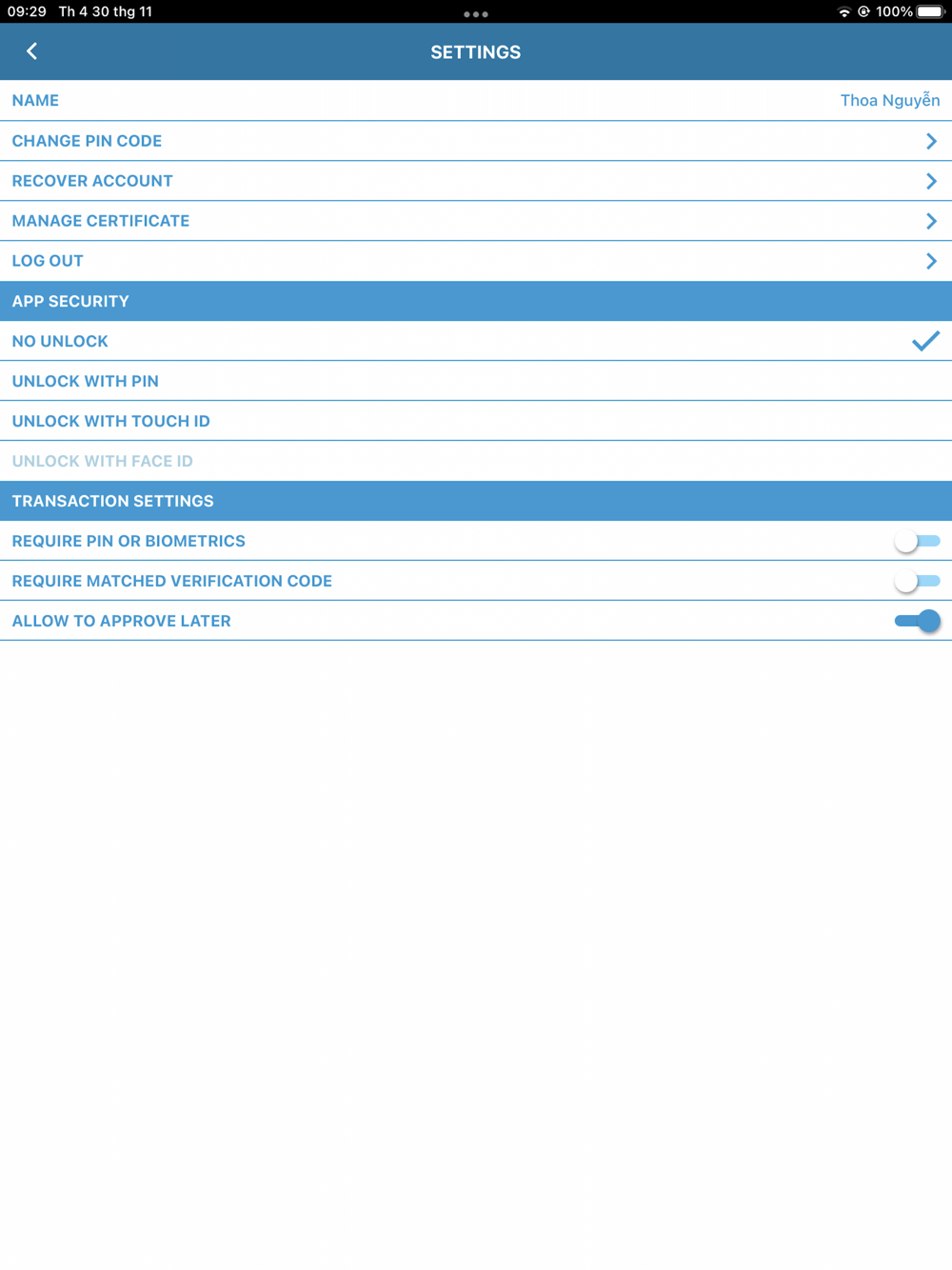 - TOUCHID, FACEID OR PIN CODE FOR UNBLOCKING ACCESS TO THE SECURE