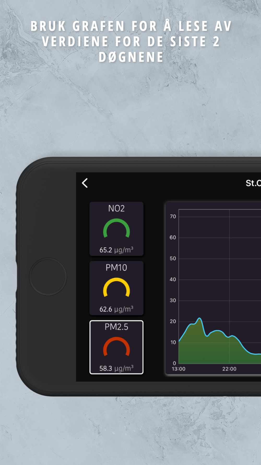 Se måledata som oppdateres hver time for luftkvaliteten på svevestøv (PM2,5 og PM10), nitrogendioksid (NO2), bakkenær ozon (O3) og svoveldioksid (SO2).