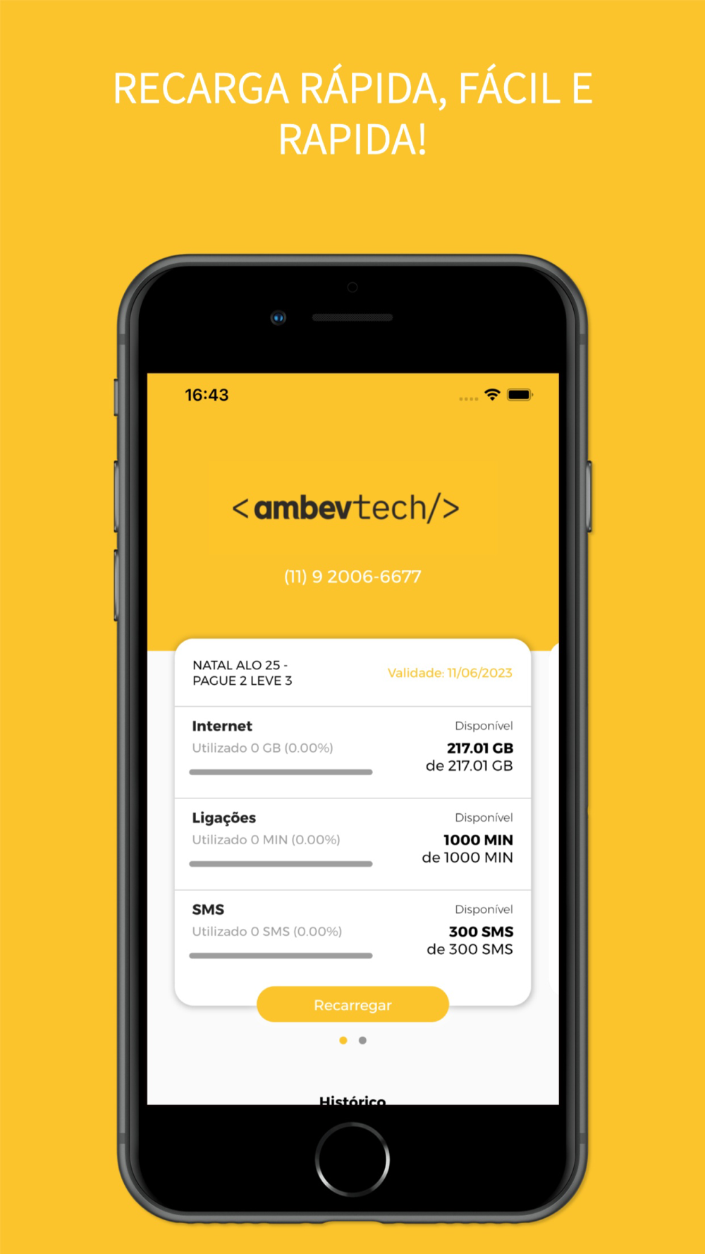 O Aplicativo é para você, usuário do Ambev Tech acessar os serviços de recarga, consulta de saldo (voz, internet e de recarga) e outros, de forma rápida, simples e na hora que quiser.