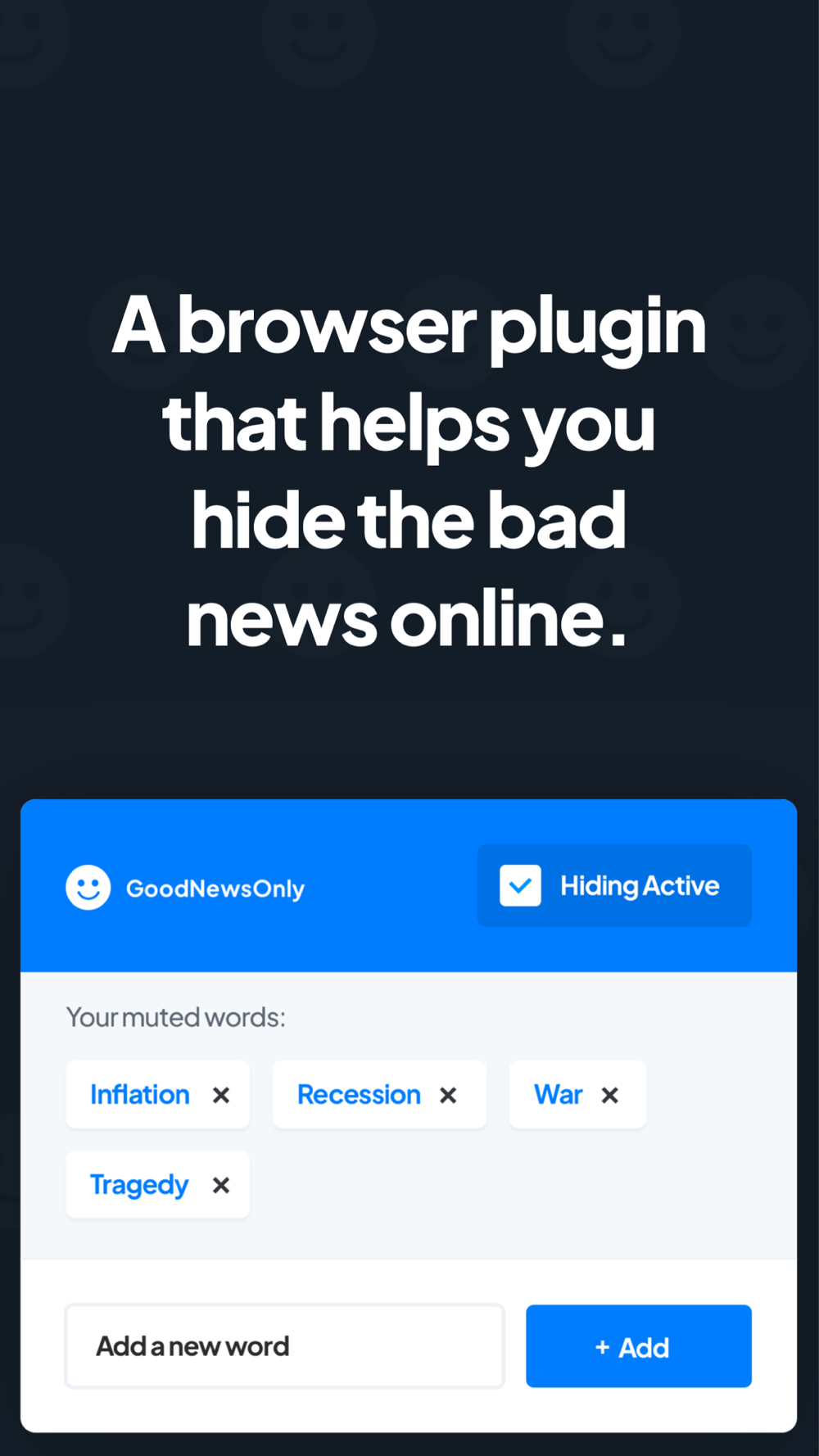 Good News Only is a browser plugin that let's you "mute" specific words on websites so news items with these words won't be visible. It's a filter on the ever negative world so you won't have to be constantly bombarded by what's wrong with it.