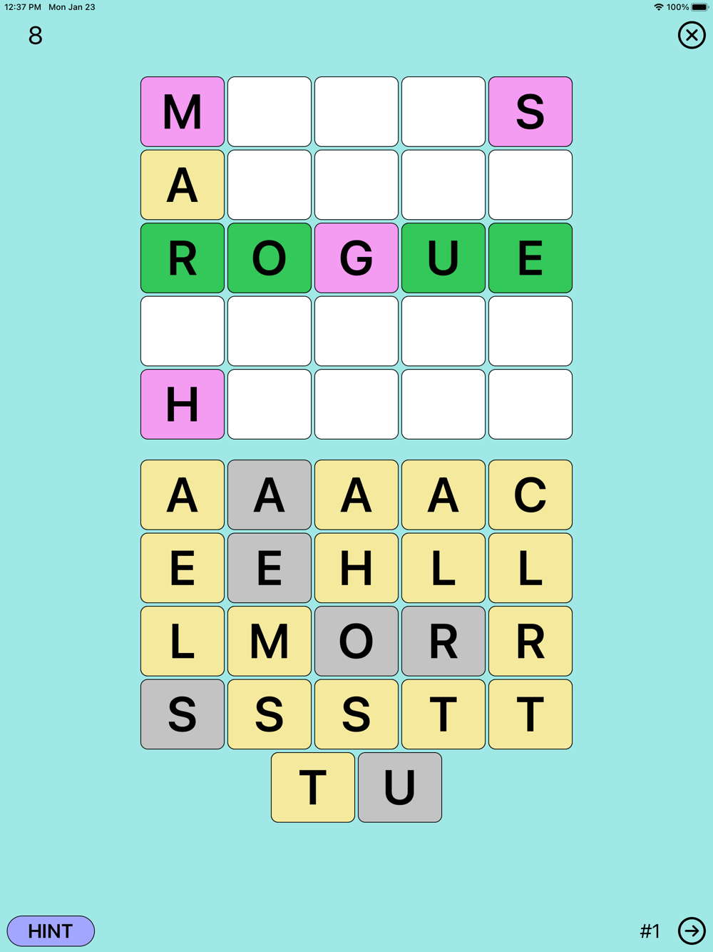 Drag letter tiles into the empty spaces to complete a grid of horizontal and vertical words. Try to solve each puzzle in the fewest number of steps. You may need a few hints to find the proper placement of the tiles into the grid; but each hint adds three points to the count, so use them sparingly. We have carefully chosen some initial letters to get you started on each puzzle.