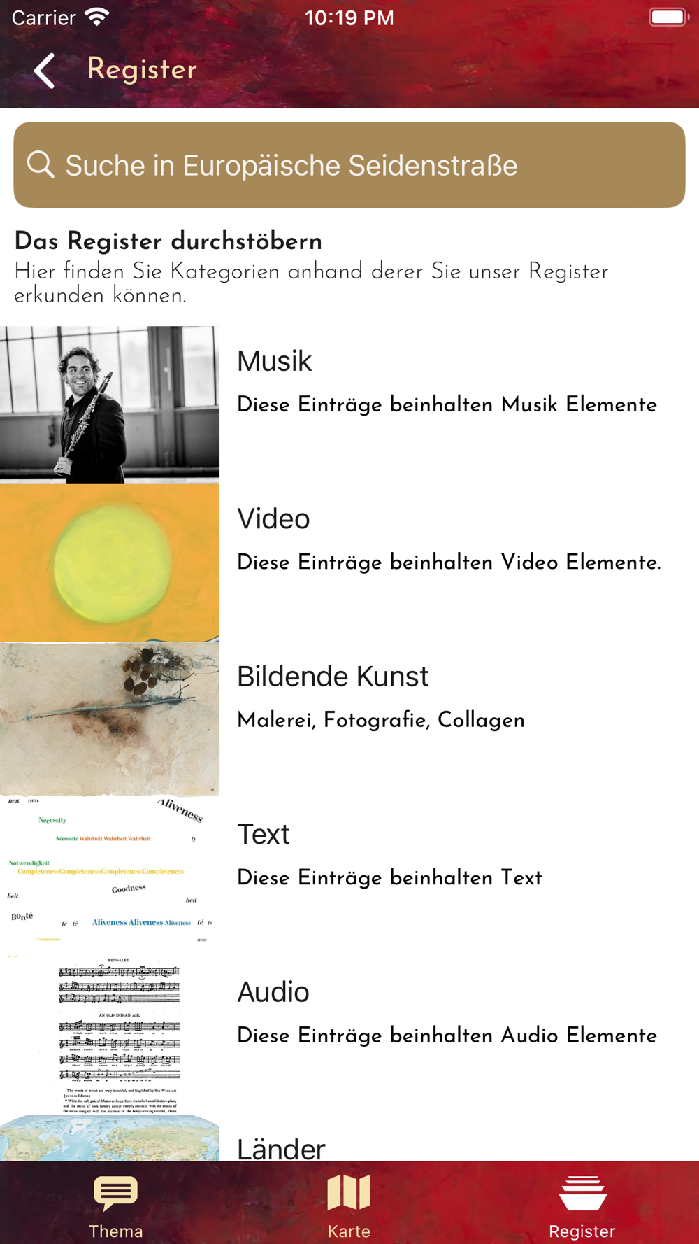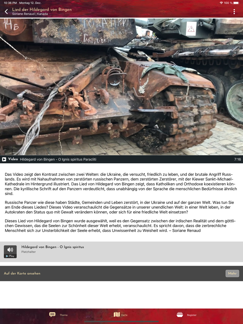 It features descriptions of each contribution in several languages. Topics and projects are explained using images of the latest personal artistic work. In addition, you can listen to audio files at numerous POIs (points of interest). You will discover image galleries, essays, poems, films, audio journeys etc. that often reveal hidden interpretations and qualities.