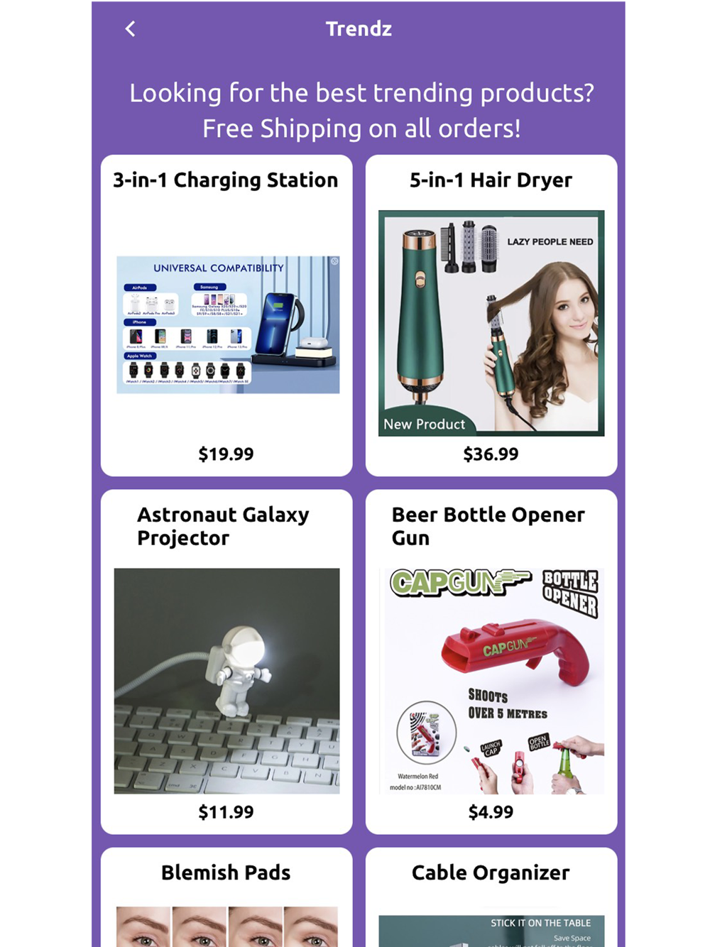 Trendz: Ever seen a tending product on social media? This category displays all of the best trending items offered at the lowest cost.