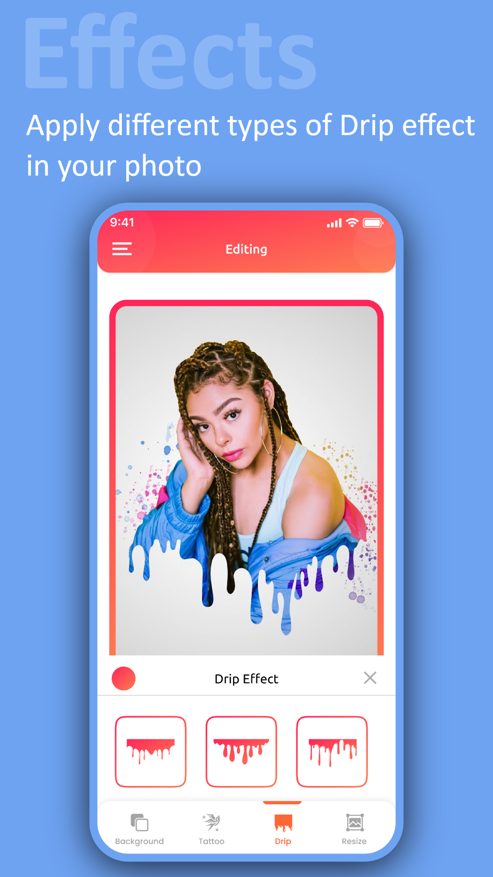 This Photo Editor Dripping feature is winning the social platforms and audiences. Select the picture and choose the drip tool with a splash of colors and saturated effects now.