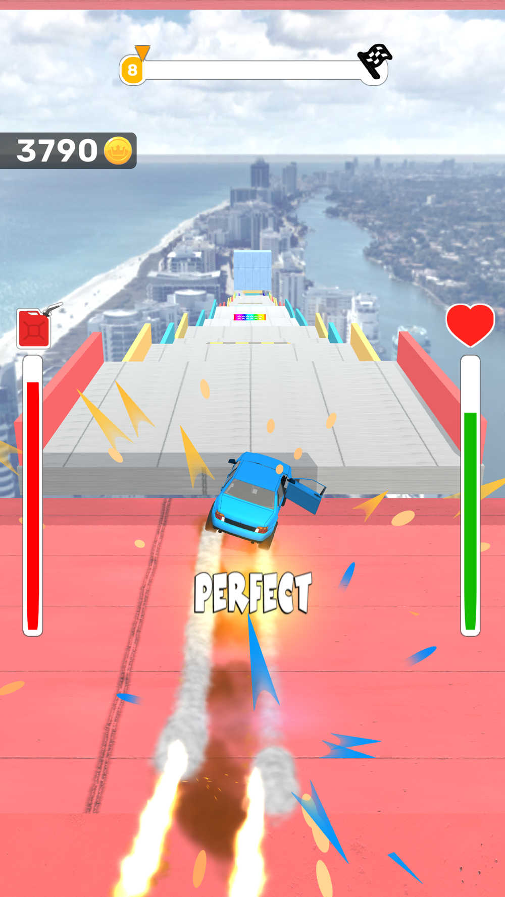 In "Horizon Ride," you'll race through the sky in a high-speed car, leaping from platform to platform. The goal is to travel as far as possible without falling off or running out of petrol. As you play, you'll have the chance to upgrade your car's petrol and health to help you reach new heights. This fast-paced game is a thrill ride that will keep you on the edge of your seat. So hop behind the wheel and see how far you can go in "Horizon Ride"!