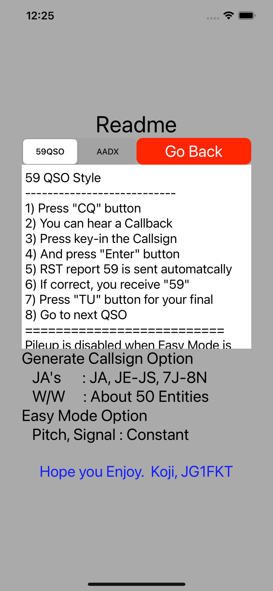 This App is a real QSO simulator for Amateur Radio(HAM). Reproduce “QSO for CQ call, and 59 report exchange". In addition, the call sign and the voice quality (tone, speech speed) signal level of the speaker differ for each QSO to provide realism. Furthermore, the call sign of your own station that issues CQ can be set arbitrarily.
