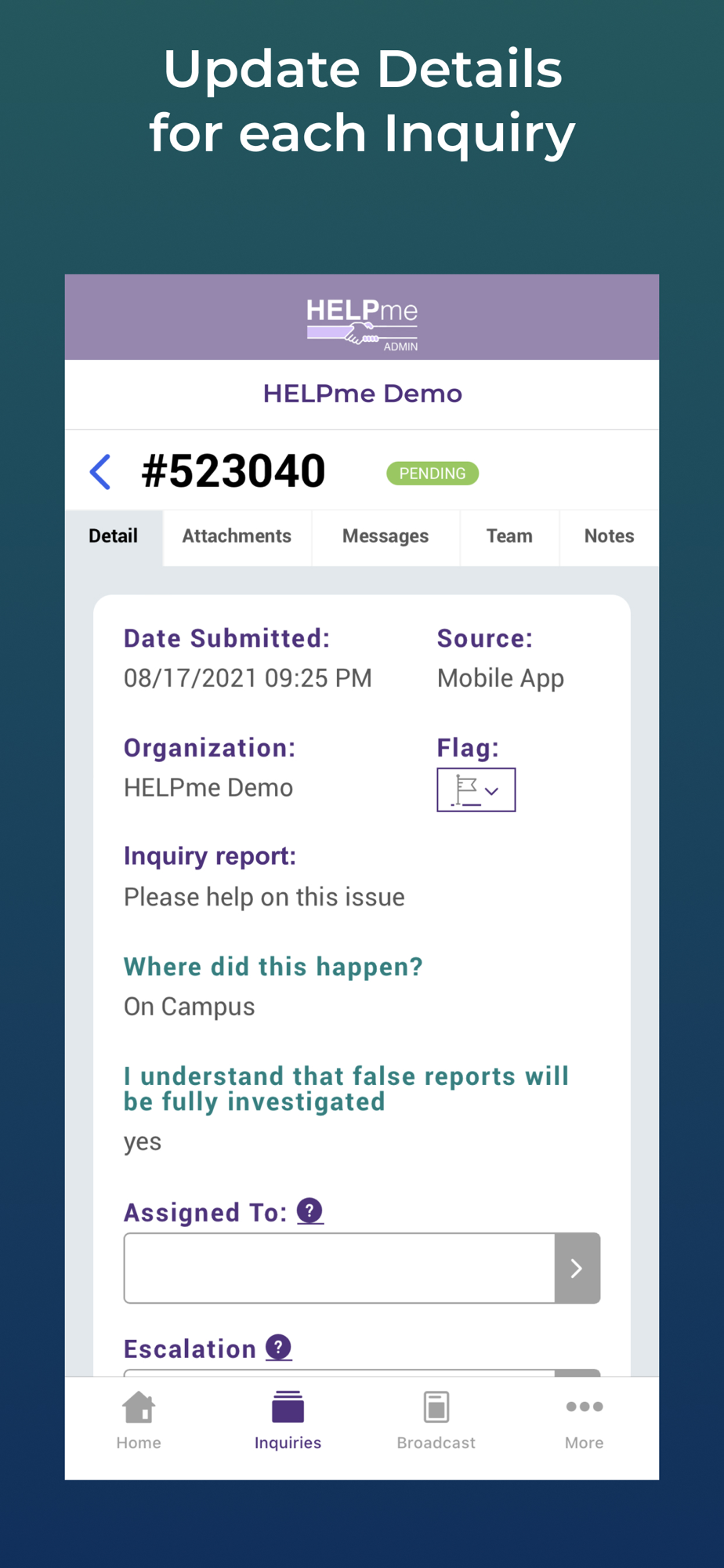 The HELPme Admin app allows authorized HELPme administrators to access and manage inquiries from their mobile devices. All of the inquiry management features of the desktop interface are available in the app: