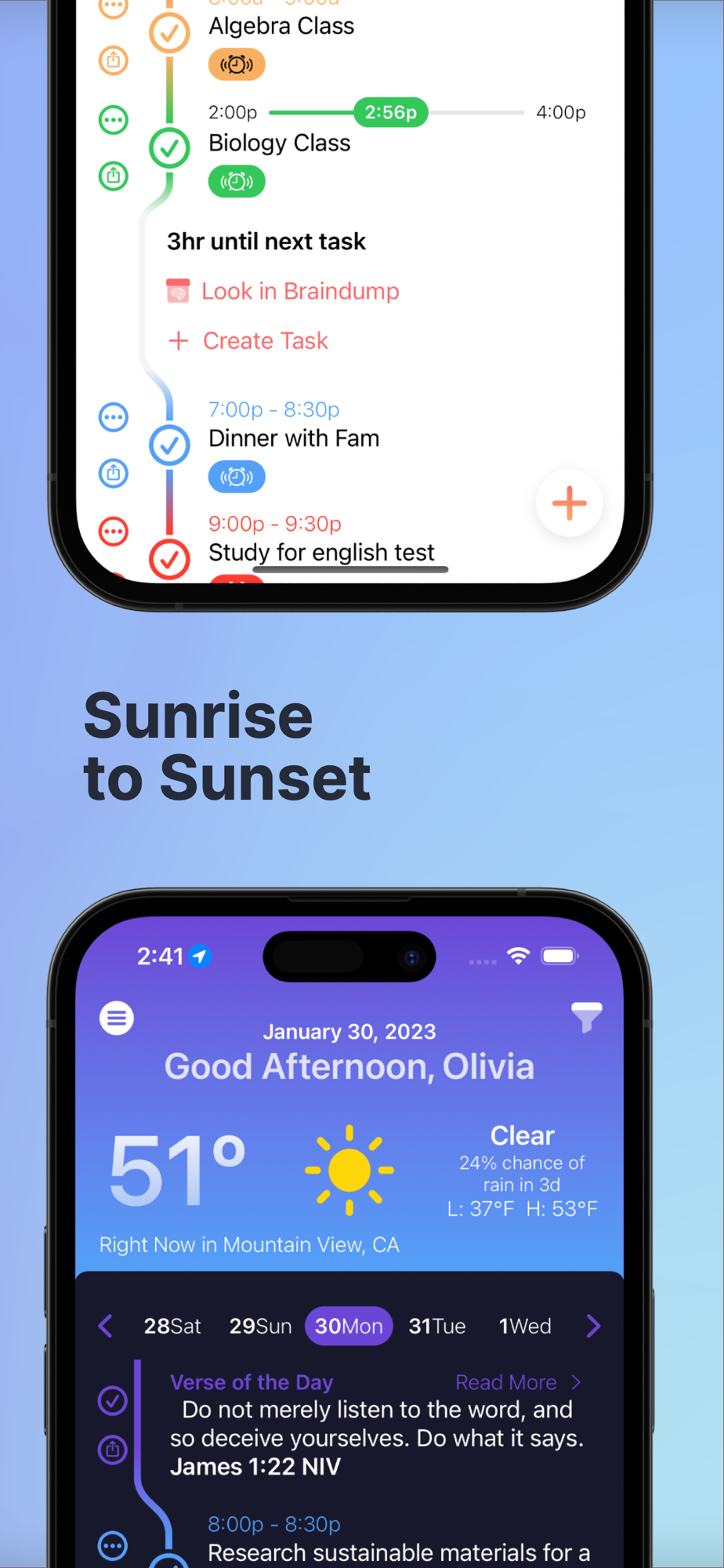 In addition to task scheduling, Today also has some nice bonus features that can add value to your day. The dashboard shows the weather for the day, including the current temp, highs and lows, current conditions, and an estimate of precipitation chances. And if you're interested, there's also a Bible verse of the day specific to you (which you can disable if you prefer).