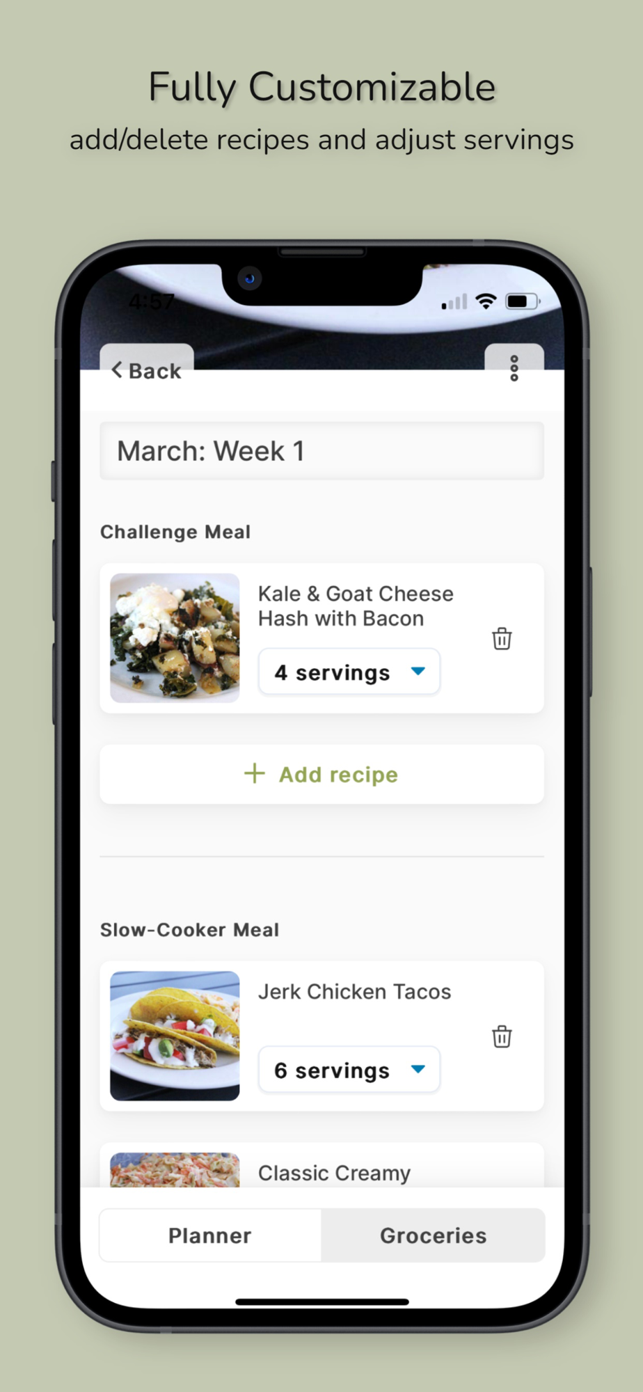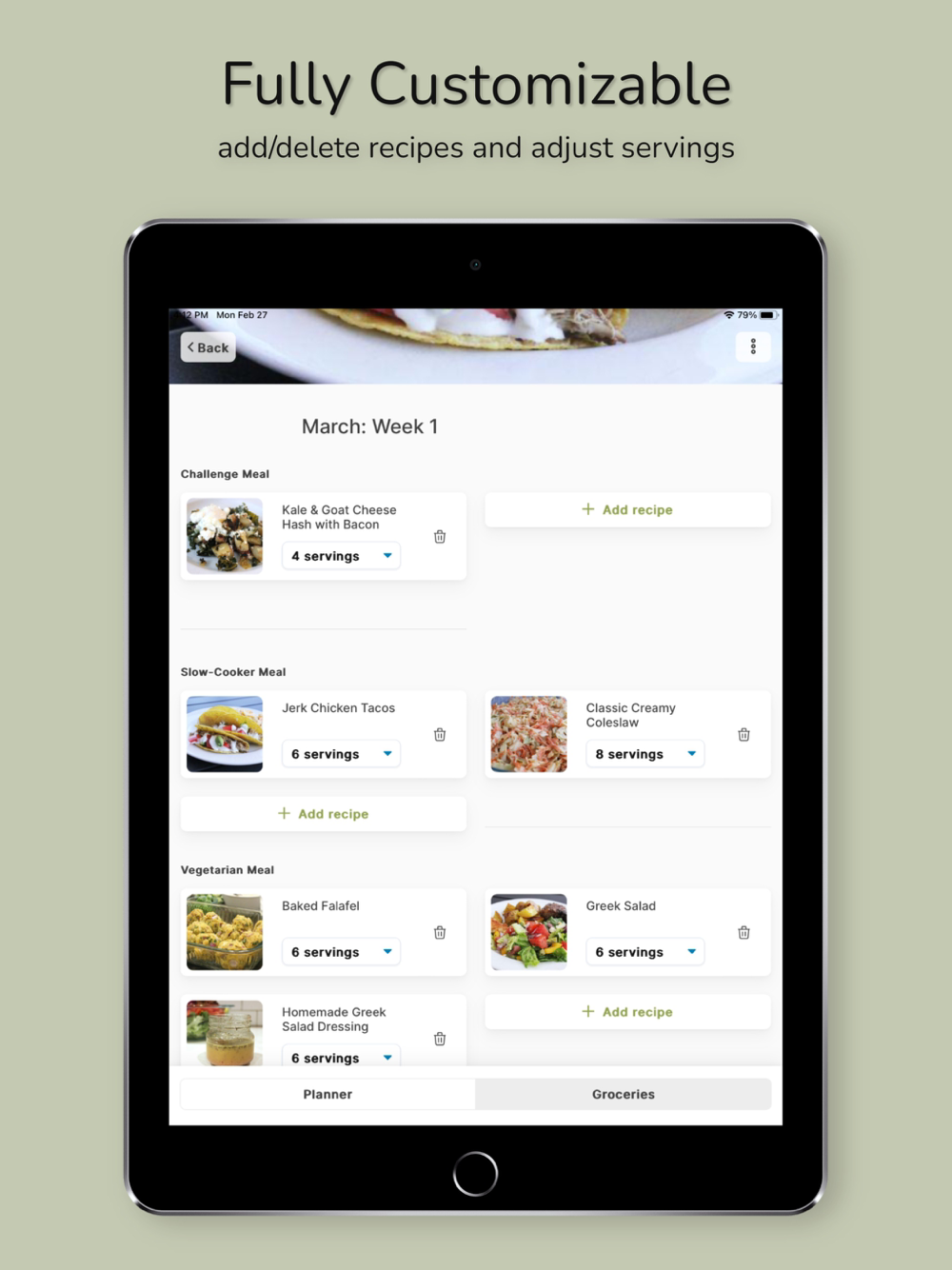 FULLY CUSTOMIZABLE: delete recipes you don’t need, adjust the servings of recipes to feed more or fewer people, or to make leftovers for the week, and add in extra recipes for hungry eaters
