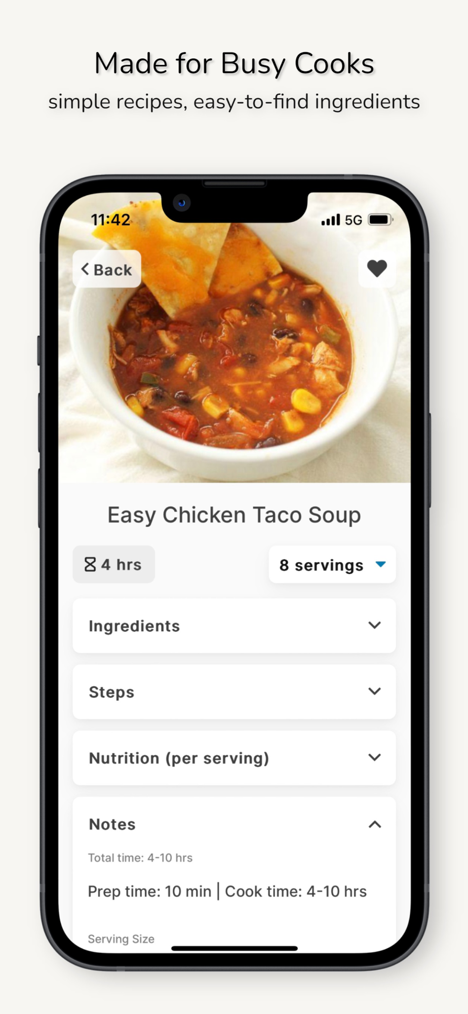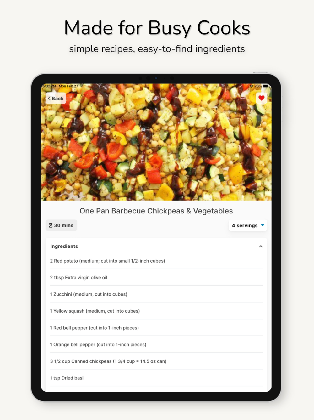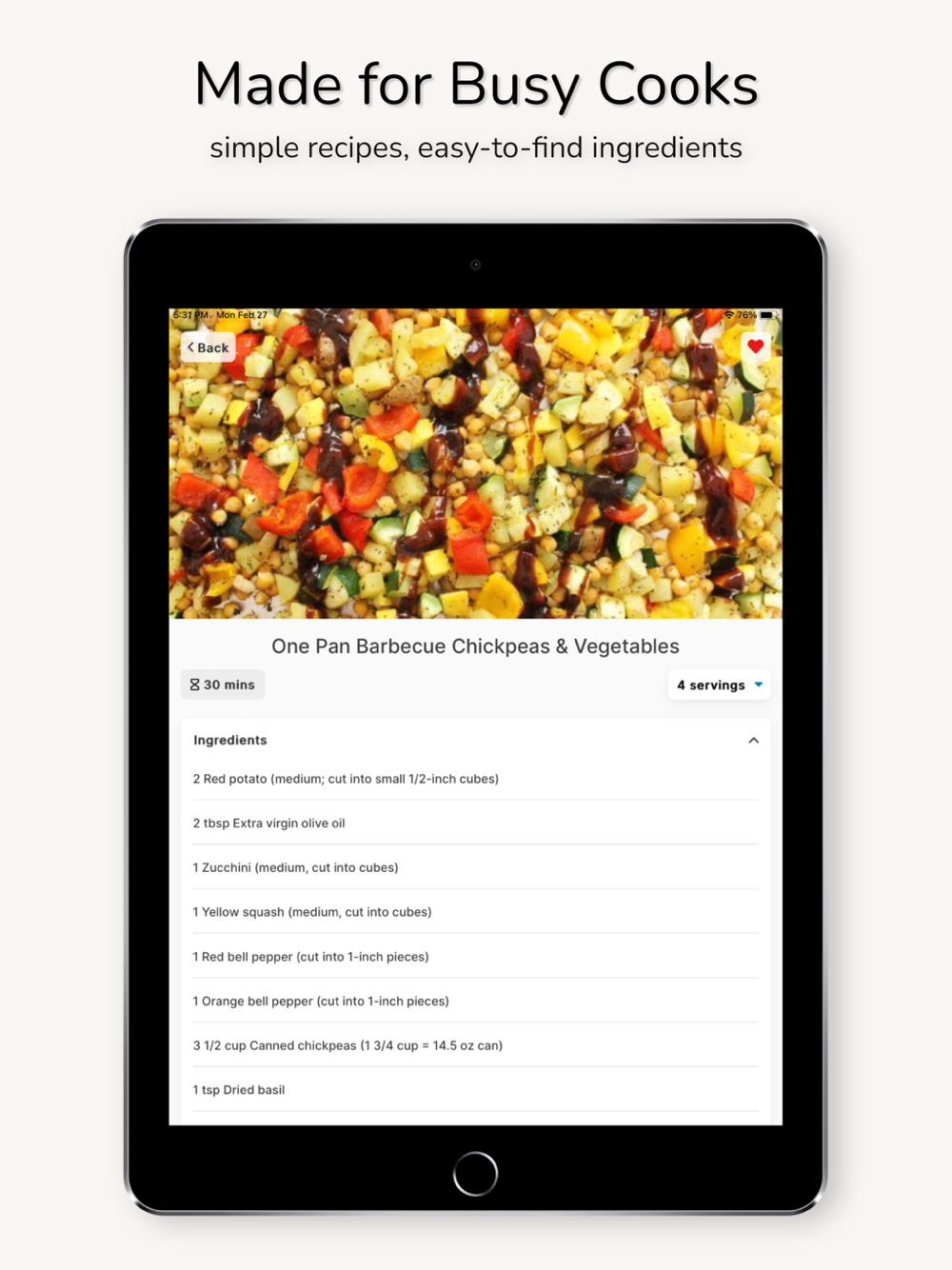 SAVE FAVORITE RECIPES: When you find a recipe you love, tap the heart to save it as a favorite and it will appear at the top of your recipe list.