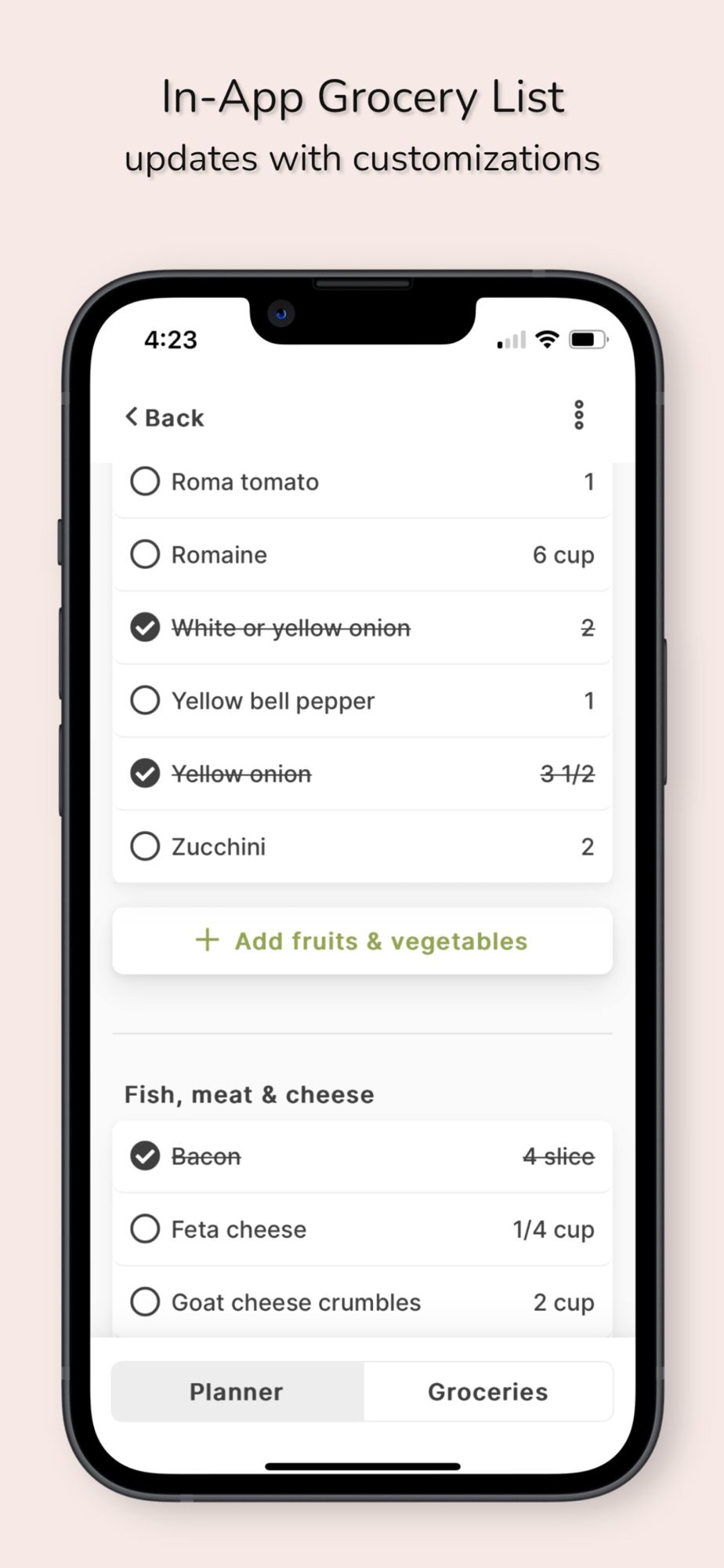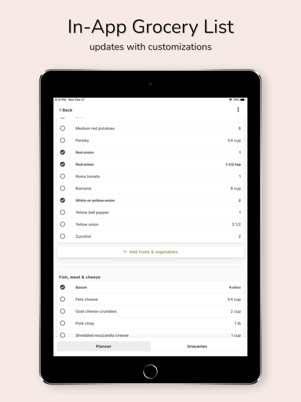 Step 2: FINALIZE your Grocery List - Your customizations update automatically in the made-for-you grocery list. Next, add your family’s staples and cross off items you already have.
