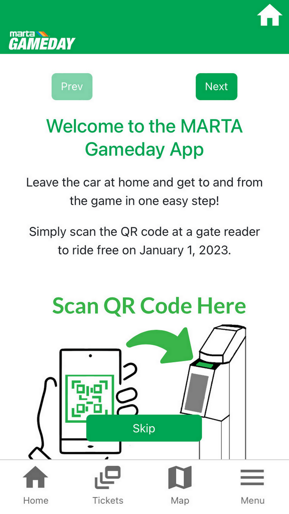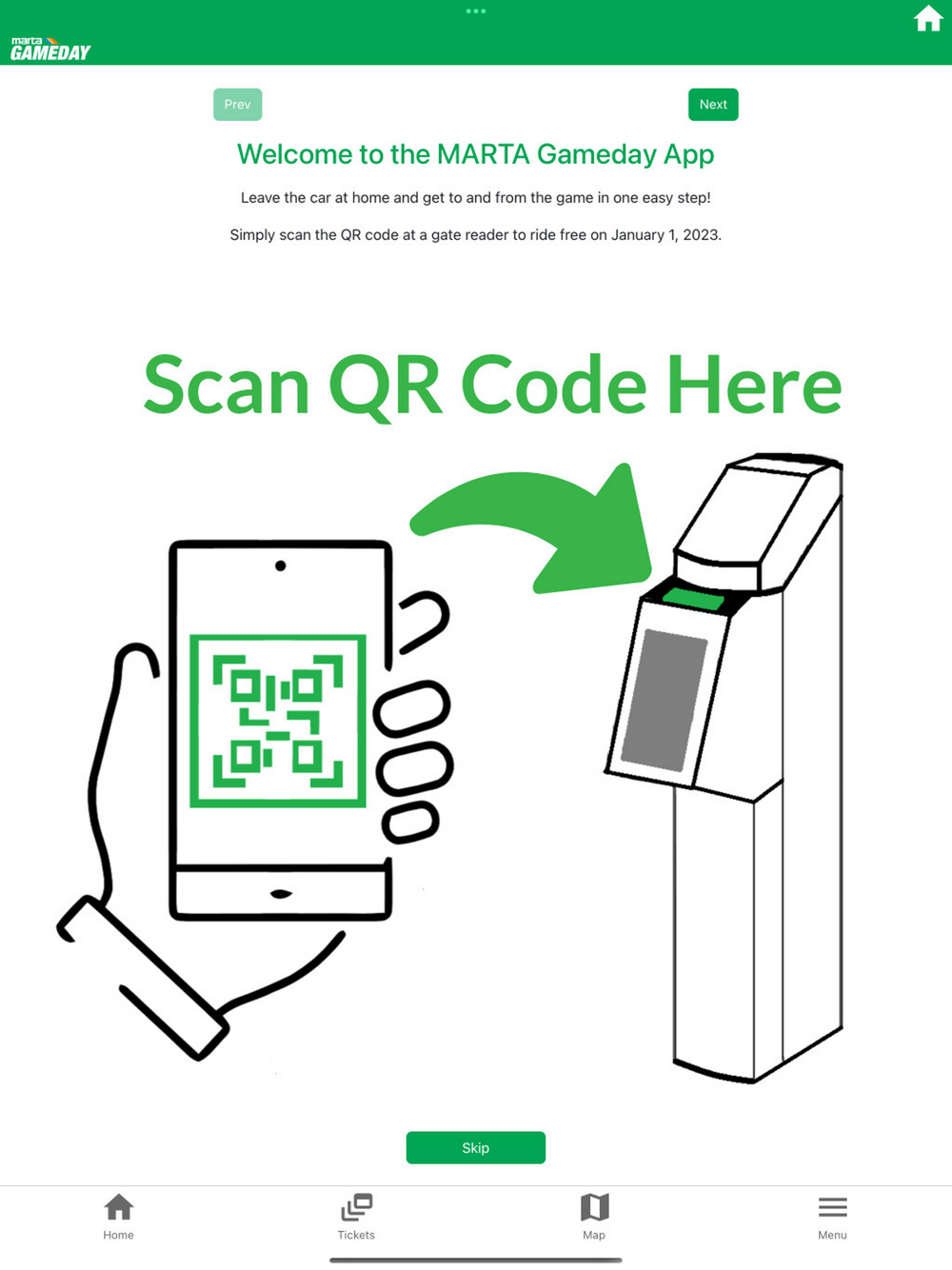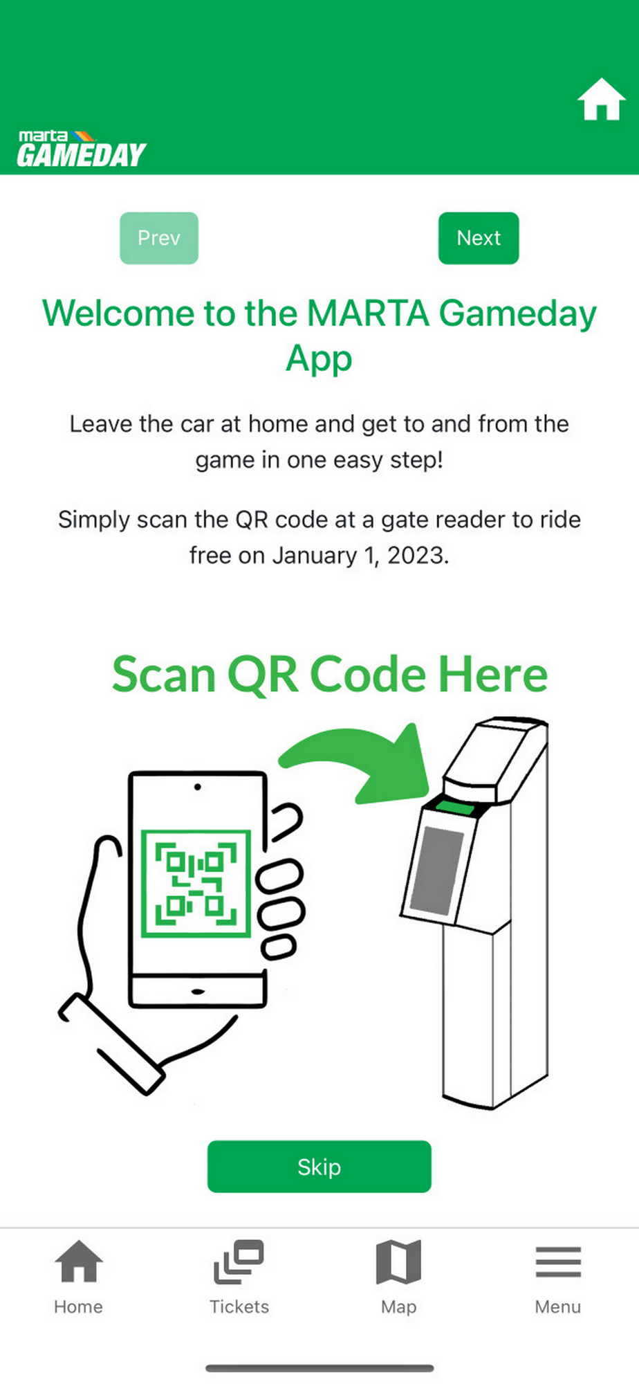 With the MARTA Gameday app, you can use the QR code for a free ride on the MARTA services to and from the game.