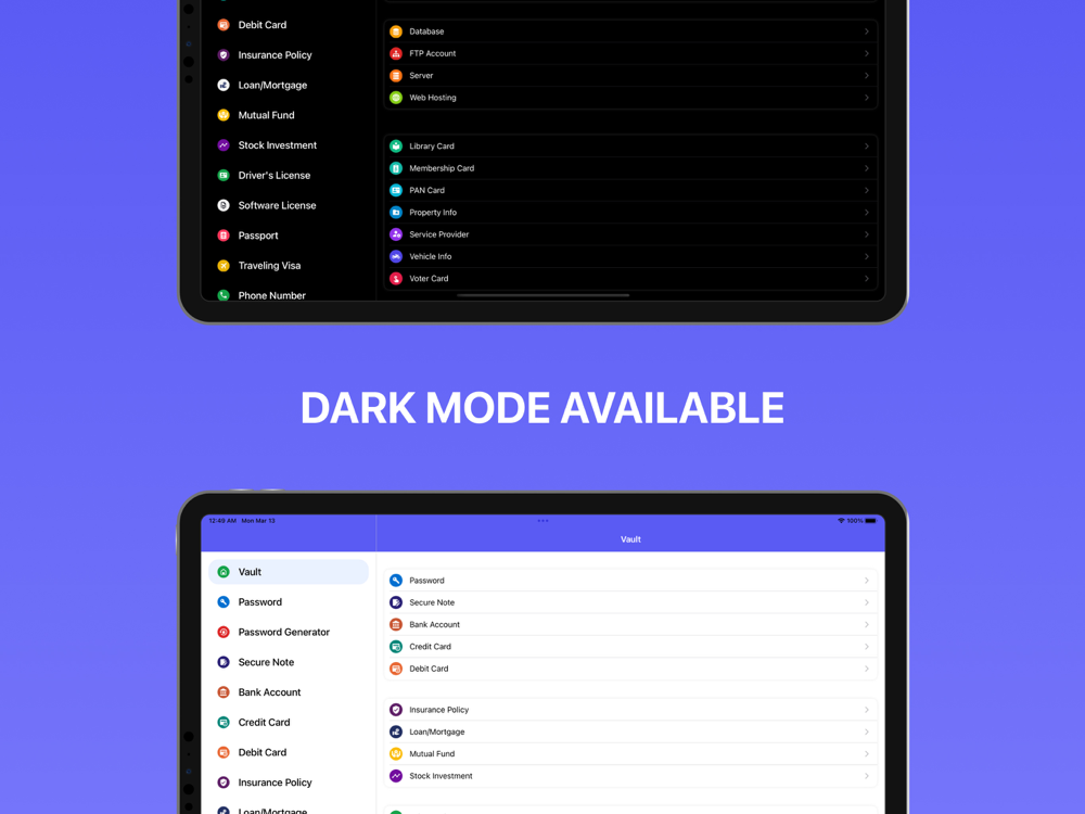 • Store information of payment cards like credit cards, debit card, addresses, secure note, bank accounts, driver licenses, Health Insurance, Insurance Policy, loan/mortgage, mutual fund, passports, certificate, id card , cell phone Info , calling card, ssh key, stock investment, software license, traveling visa, database, FTP account, server, web Hosting, library card, membership card, pan card, property info, service provider, vehicle info, voter card and more.