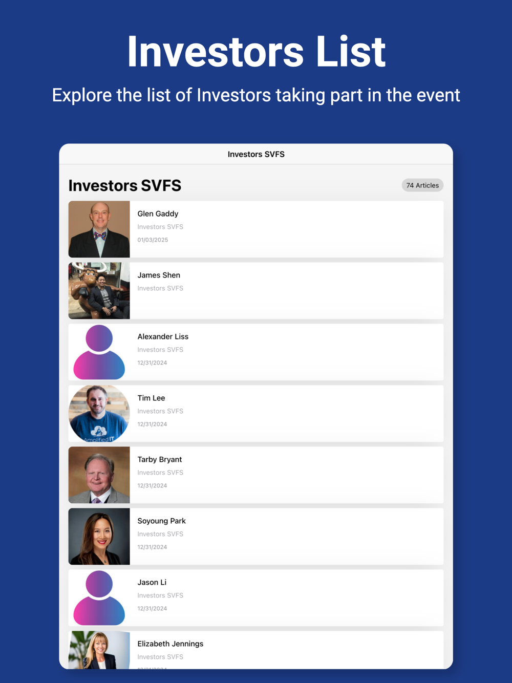 We select the investors who apply as judges. They introduce themselves and then listen to the pitches, and give their feedback to the entrepreneurs. They will score the pitches and will choose he top 5 presentations. The app facilitates the scoring.