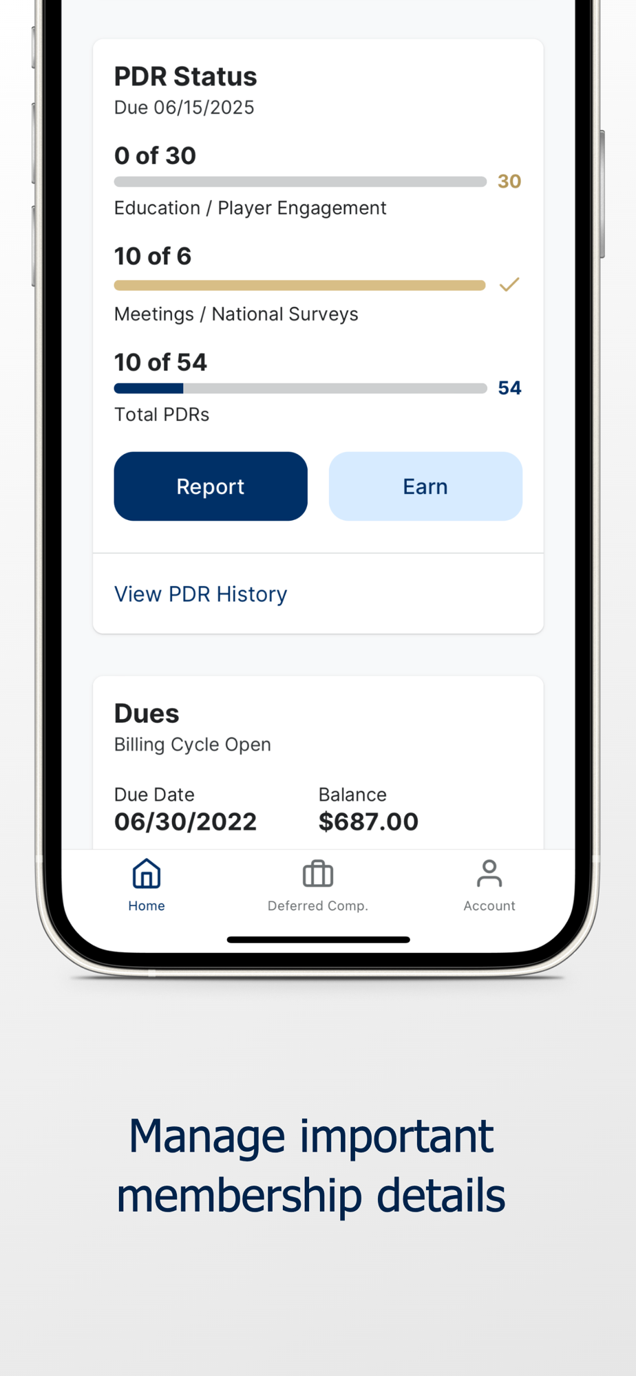 An all-new app, just for PGA Members. Within this app, Members will be able to manage their membership information, enroll in and manage their activity in the PGA Deferred Compensation Plan, view important announcements and account details, and manage dues payments. We're only getting started – the new app will continue to grow and help Members in their careers.