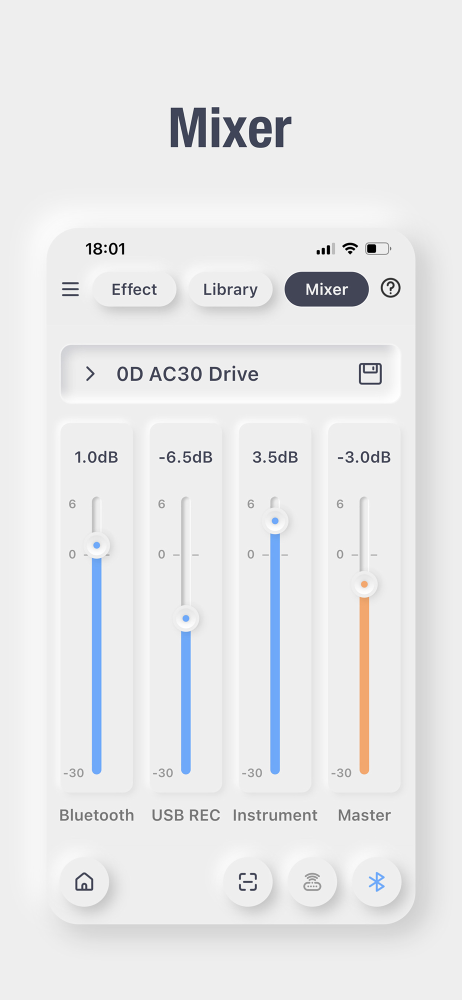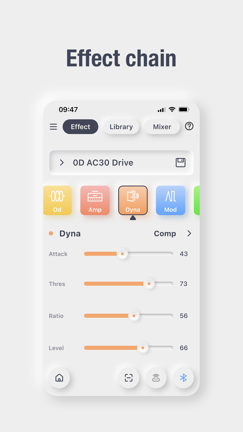 2. Select and adjust the parameters of the amp model, eq, and modulation effects through the App.