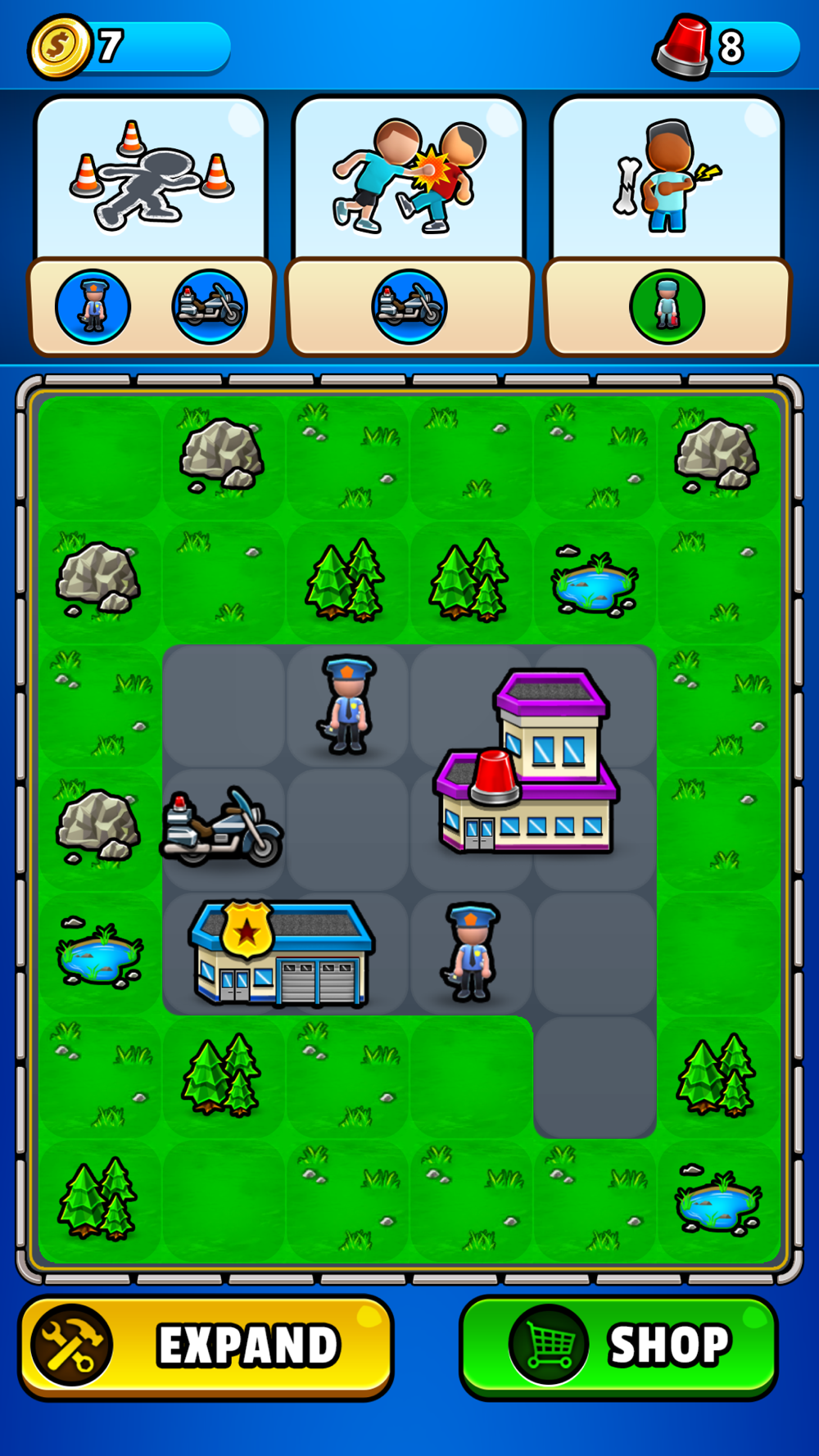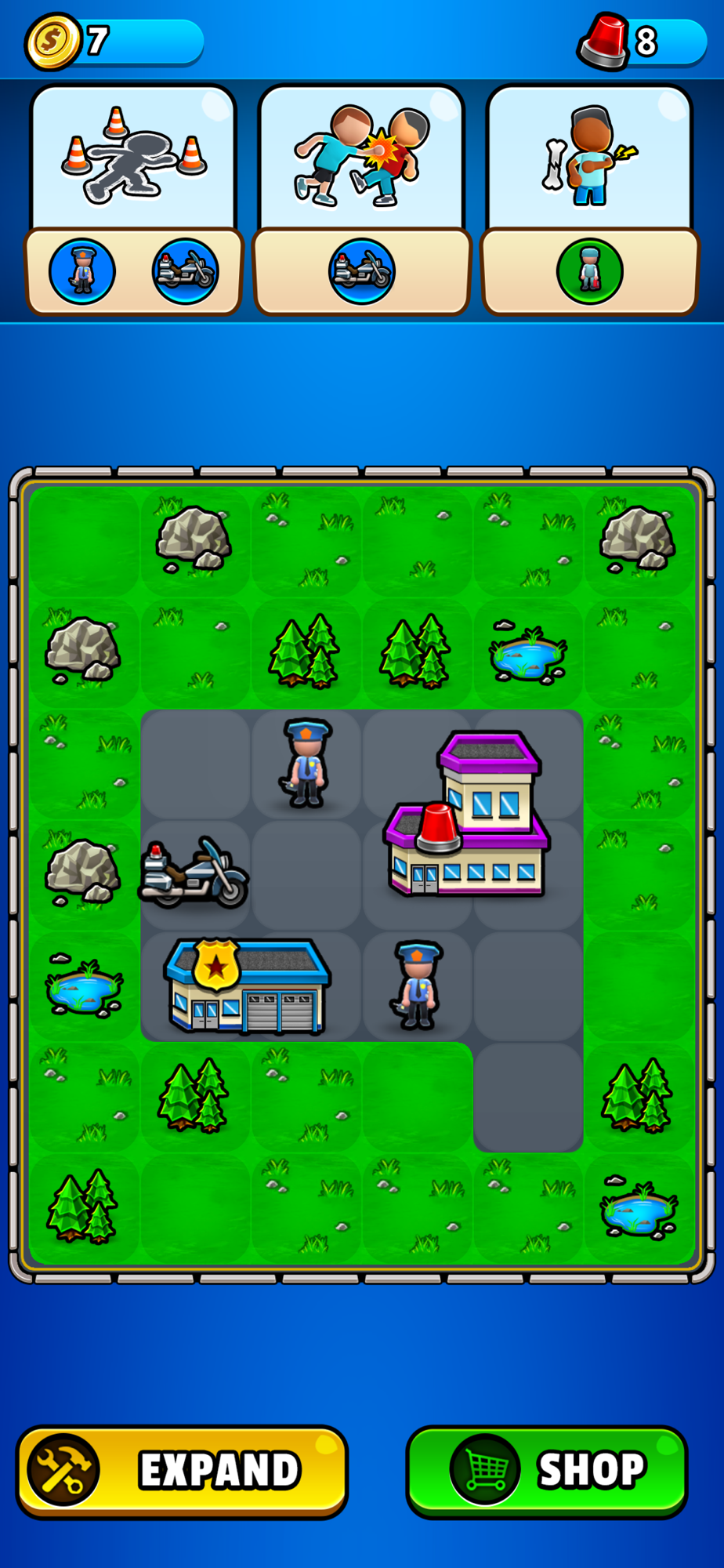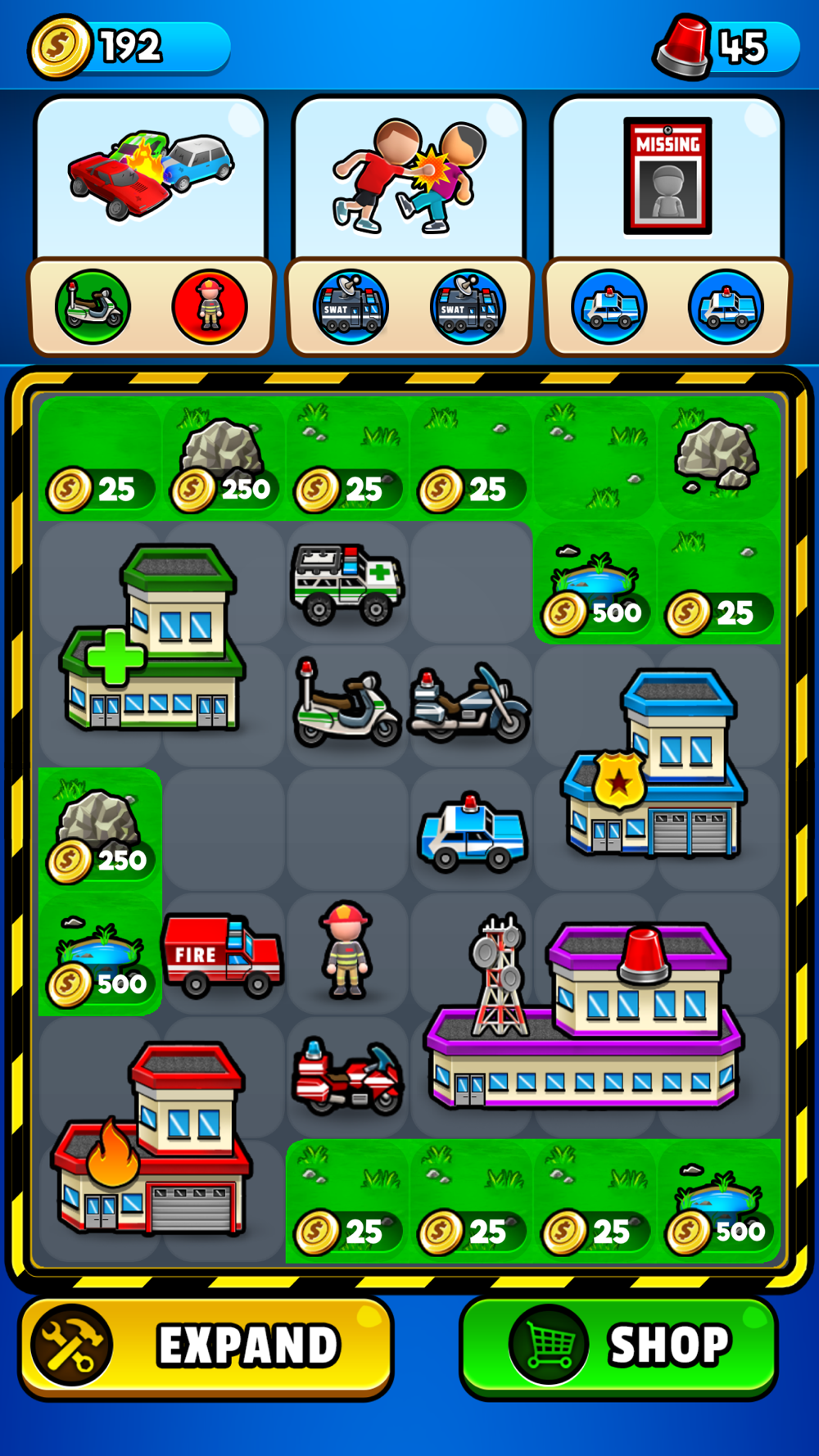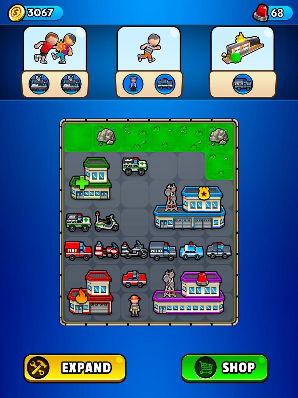 Merge police, fire and healthcare workers to make bigger and better vehicles. Build up your network to deal with bigger problems, and keep the money rolling in.