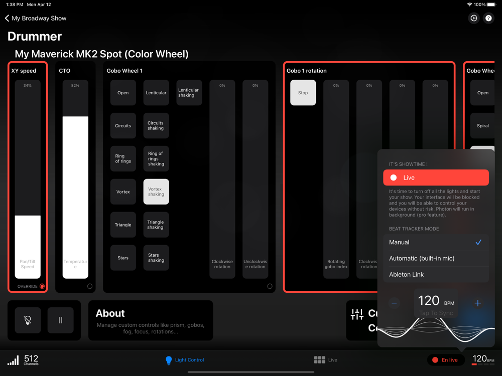 ◈ Want to turn your iPad into a real elegant personalized lighting control platform? The app features ground-breaking concepts that let you create your own user interface designed to make tasks practical and more intuitive. Connect external MIDI controllers like keyboards, pads, timecoders or others apps/softwares to control your fixtures.