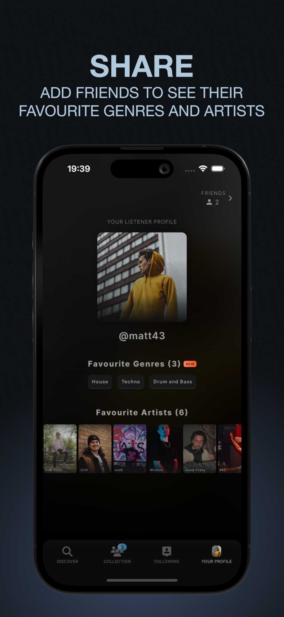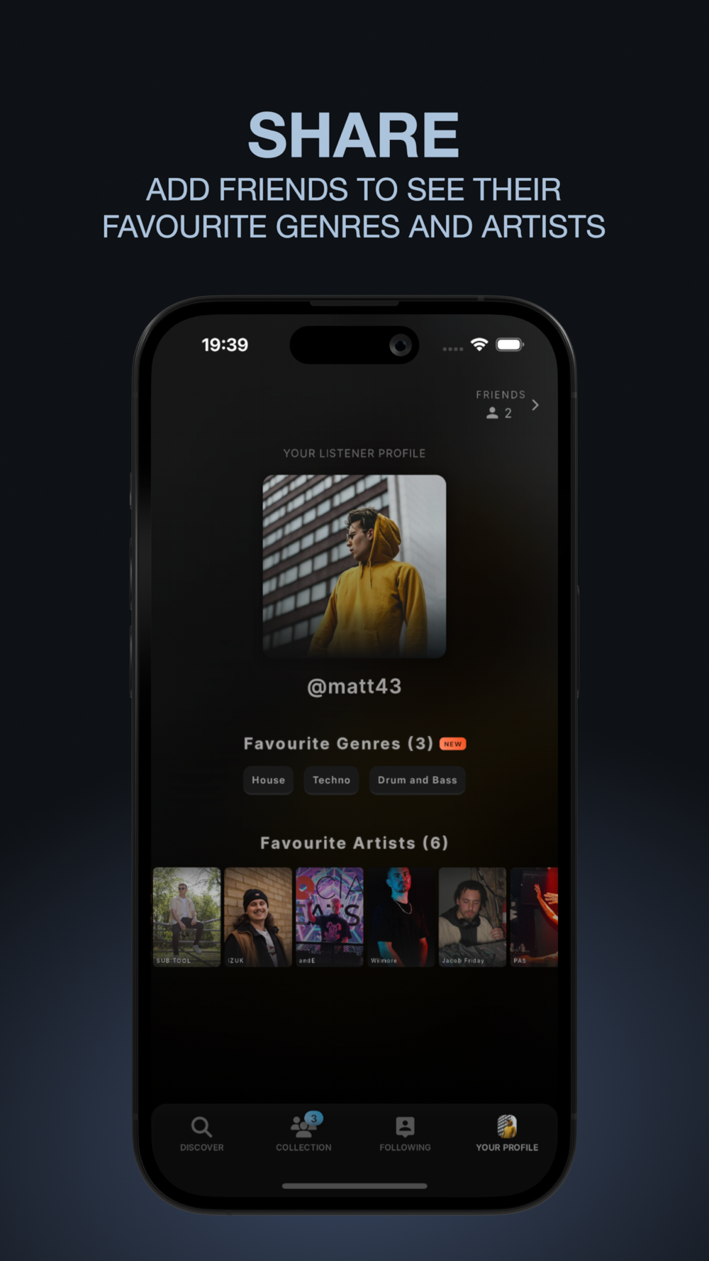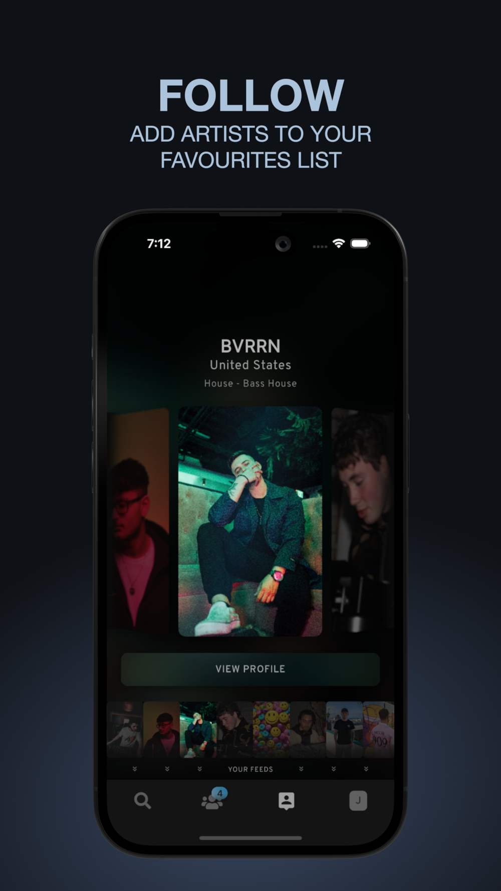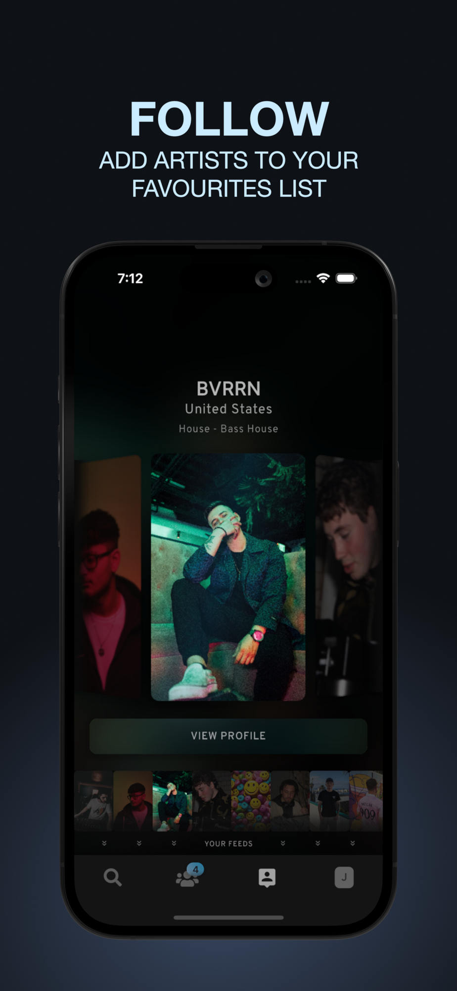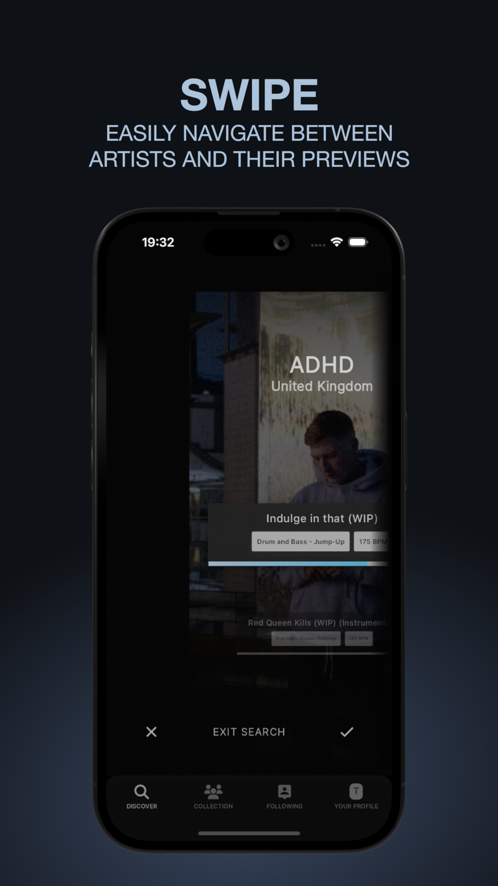 Swiping right on an artist from the search results will add them to your personal artist collection where you can view their biography, tracks previews, and social media / streaming platform links. After adding an artist to your favourites, their new tracks uploads and event announcements will appear in your personal feeds, ensuring that you stay up-to-date with their latest content.