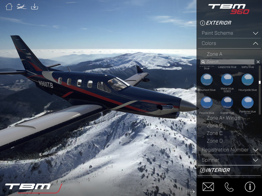 The TBM configurator enables personalization through the selection of five standard paint schemes for the exterior. From 105 colors, with the results seen in 3-D for in-flight or on-ground conditions, and in bright daylight or at dusk. For the cabin the configurator enables to choose between 8 interior selections. Additional personalization comes with the premium selection tool, while a “do it yourself” option provides a choice of 40 additional leather shades.
