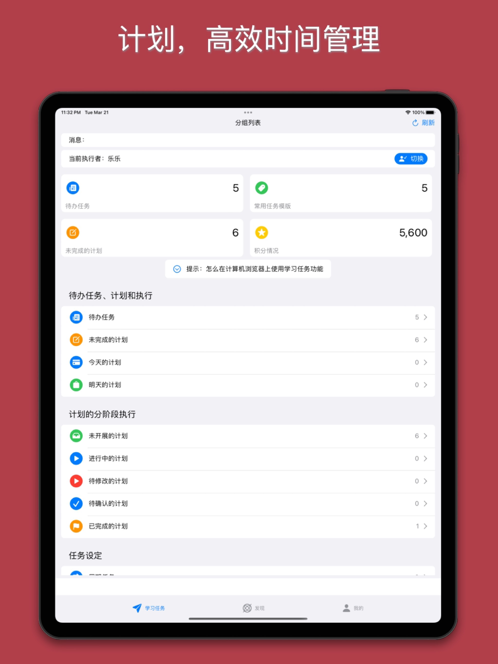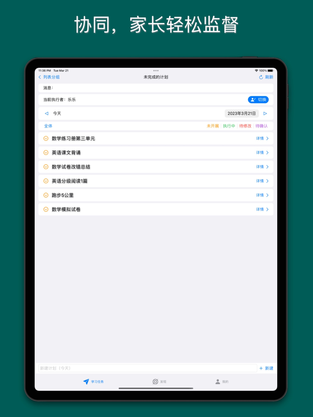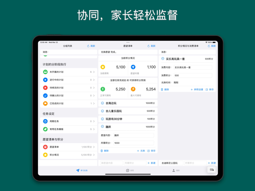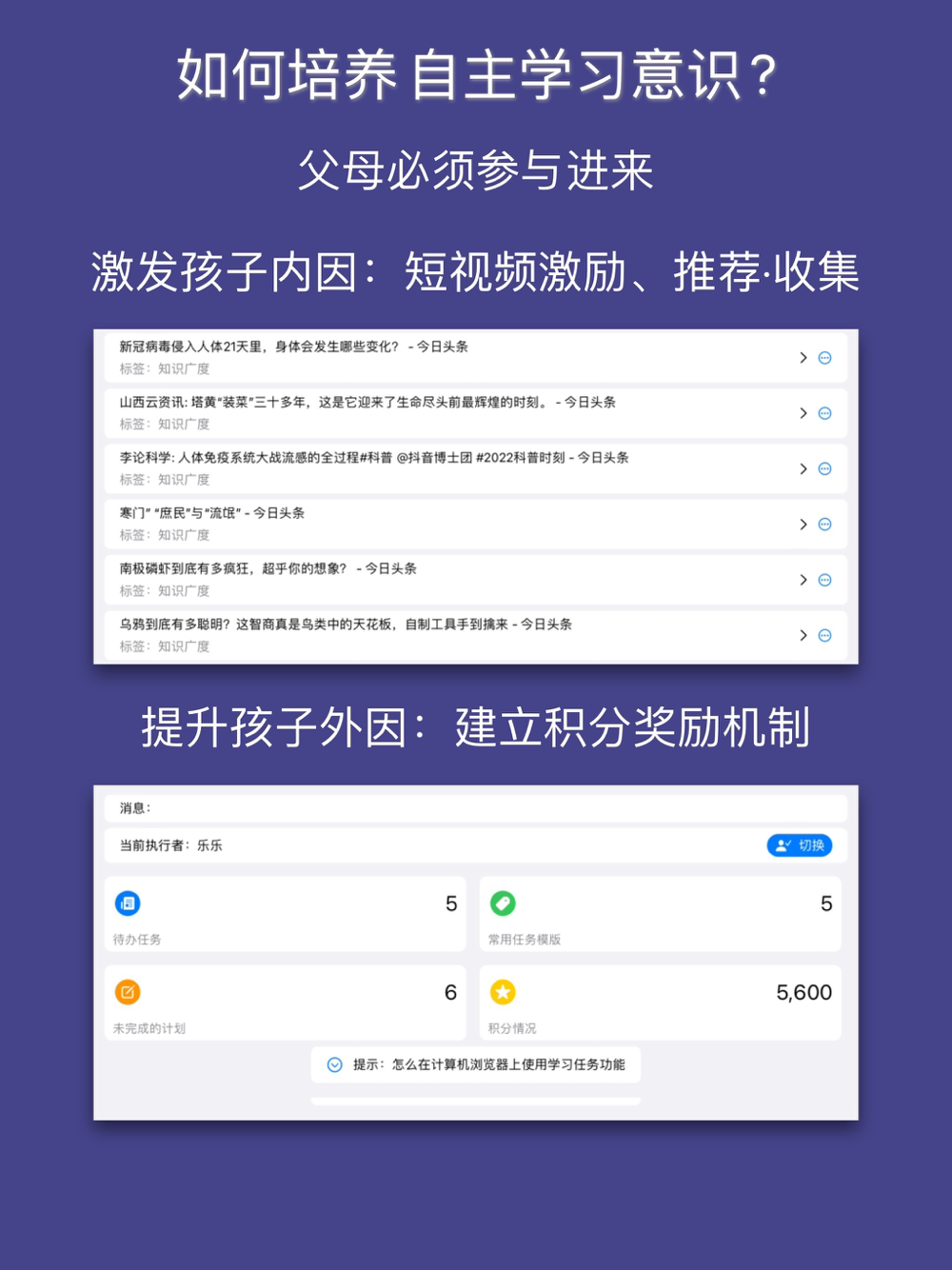 1、【辅导孩子管理学习计划】支持父母协同的学习任务(计划)管理、执行监督、激励,积分、愿望清单。