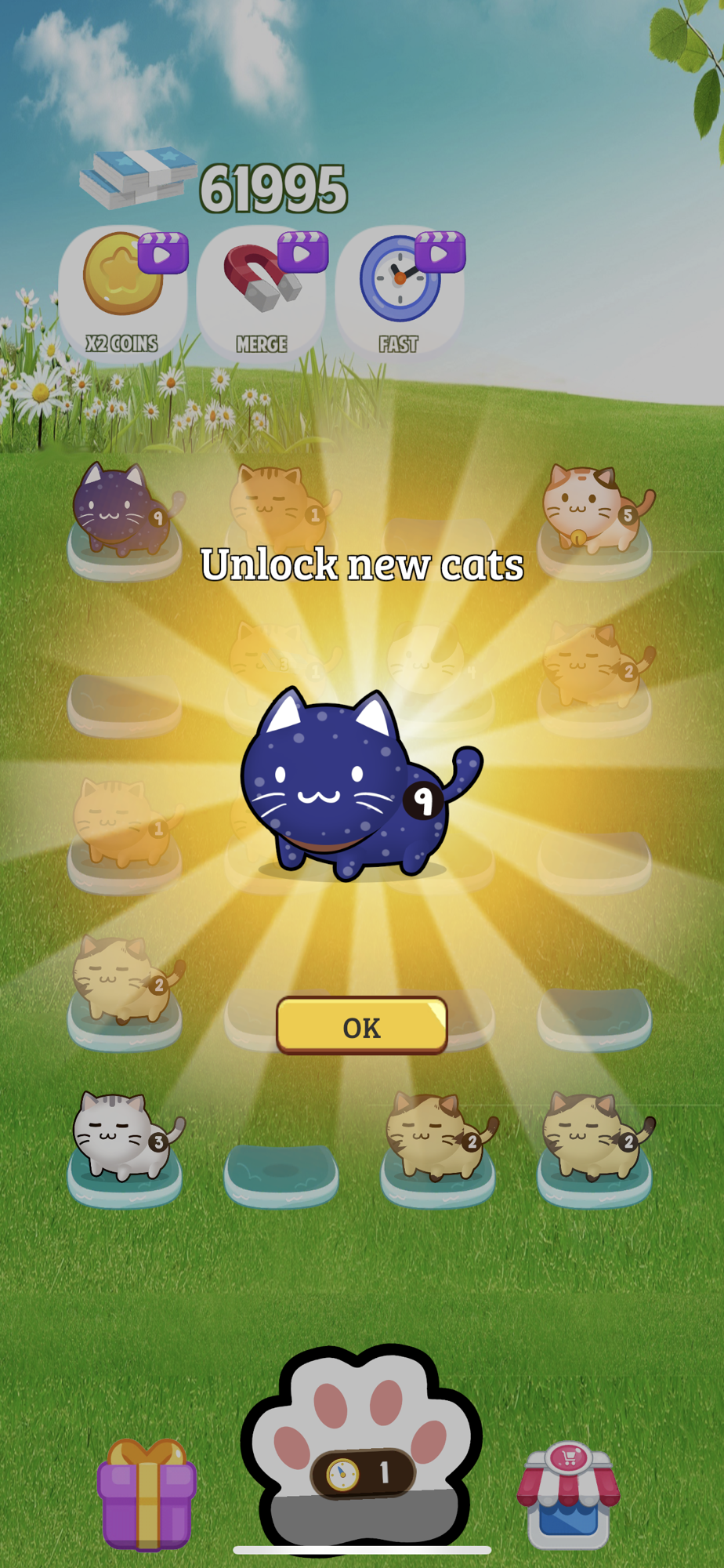 Don't wait and start building your cat collection now! You will start with one cat and then it's up to you how big your collection will get. Can you discover all the cats in the game? The more you merge, the cuter cats you will get. This clicker game is very simple. Buy a virtual cat, merge it, and gain money for a new cats and play cats games. Collect more cats and earn more, even when you are offline. Enjoy this simple idle tycoon simulator anytime and anywhere!
