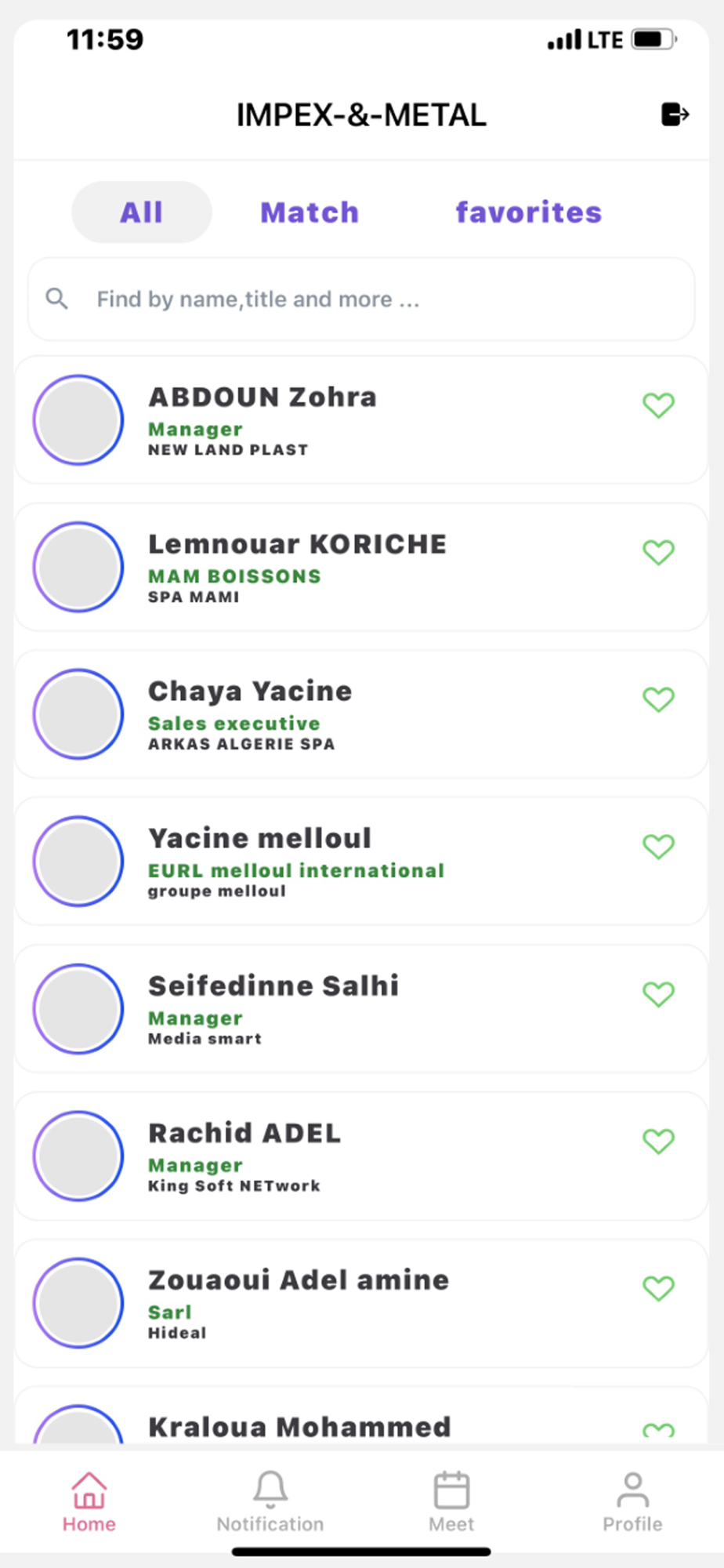 Le système de matchmaking de B2B Lab est conçu pour s'adapter aux besoins de chaque entreprise. En utilisant les informations sur l'entreprise, les besoins et les attentes des participants, l'application suggère des profils pertinents pour des rencontres professionnelles. Les profils recommandés par B2B Lab sont des entreprises ou des individus qui ont des intérêts et des objectifs communs avec les entreprises participantes.