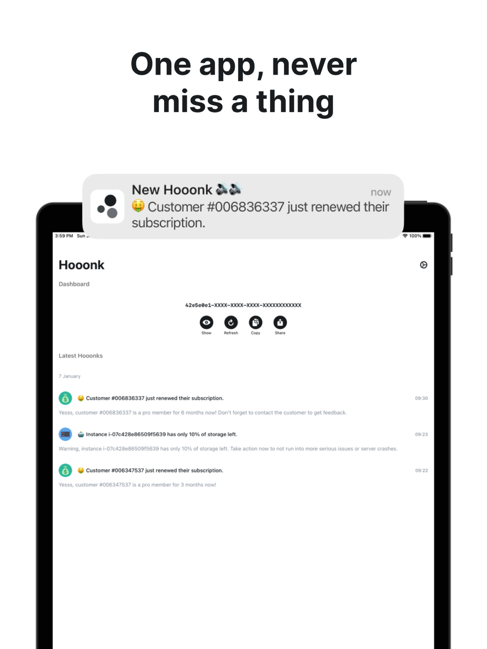 Simply use the code displayed in the app and visit https://hooonk.com/docs to get started.