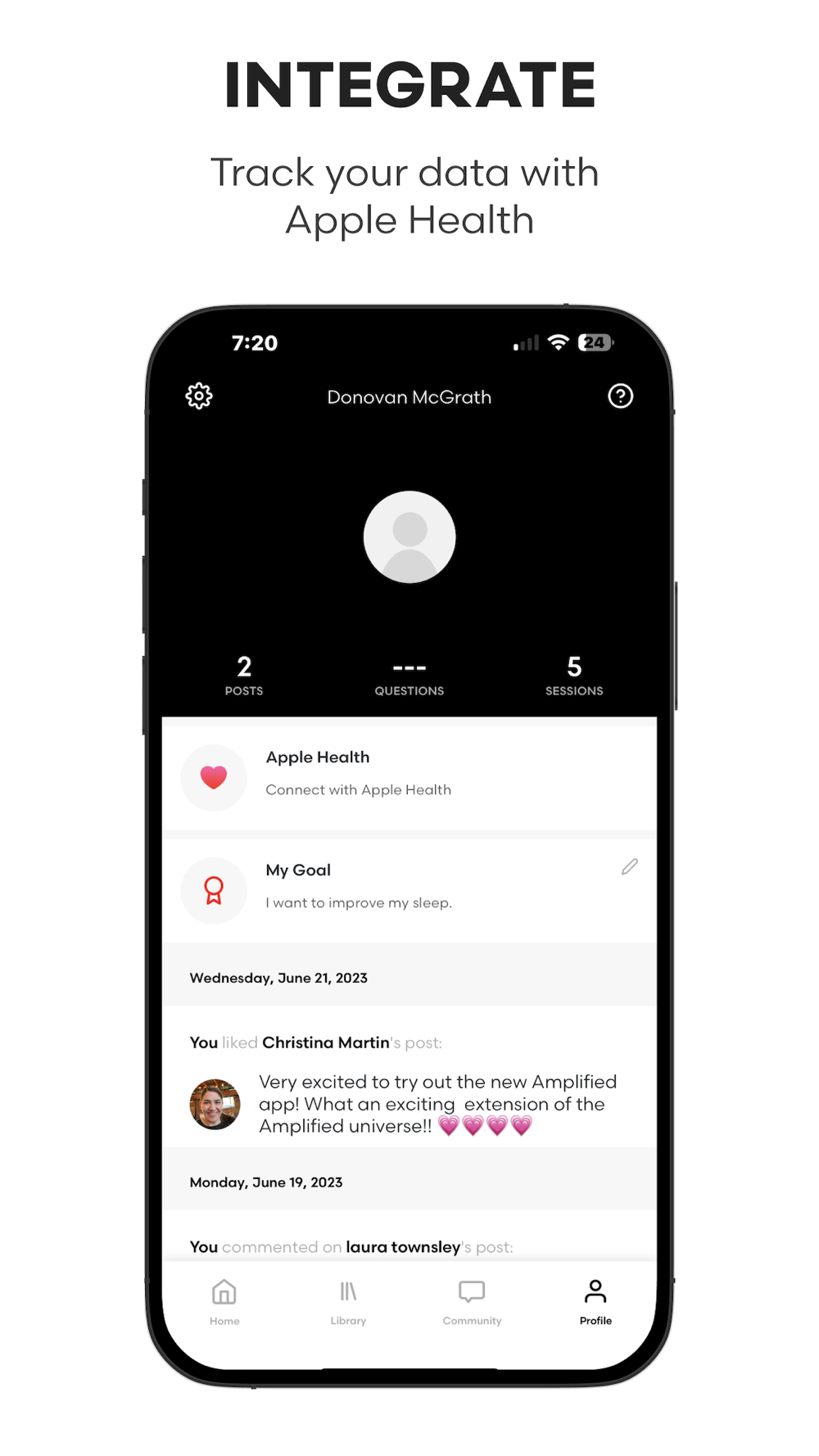 The Amplified Yoga app offers an intuitive and user-friendly interface, allowing you to effortlessly navigate through various curated programs and personalized recommendations. Track your progress, set goals, and celebrate milestones as you embark on your unique journey of self-discovery. Sync your activity data with Apple Health to keep all your health and wellness information in one place.