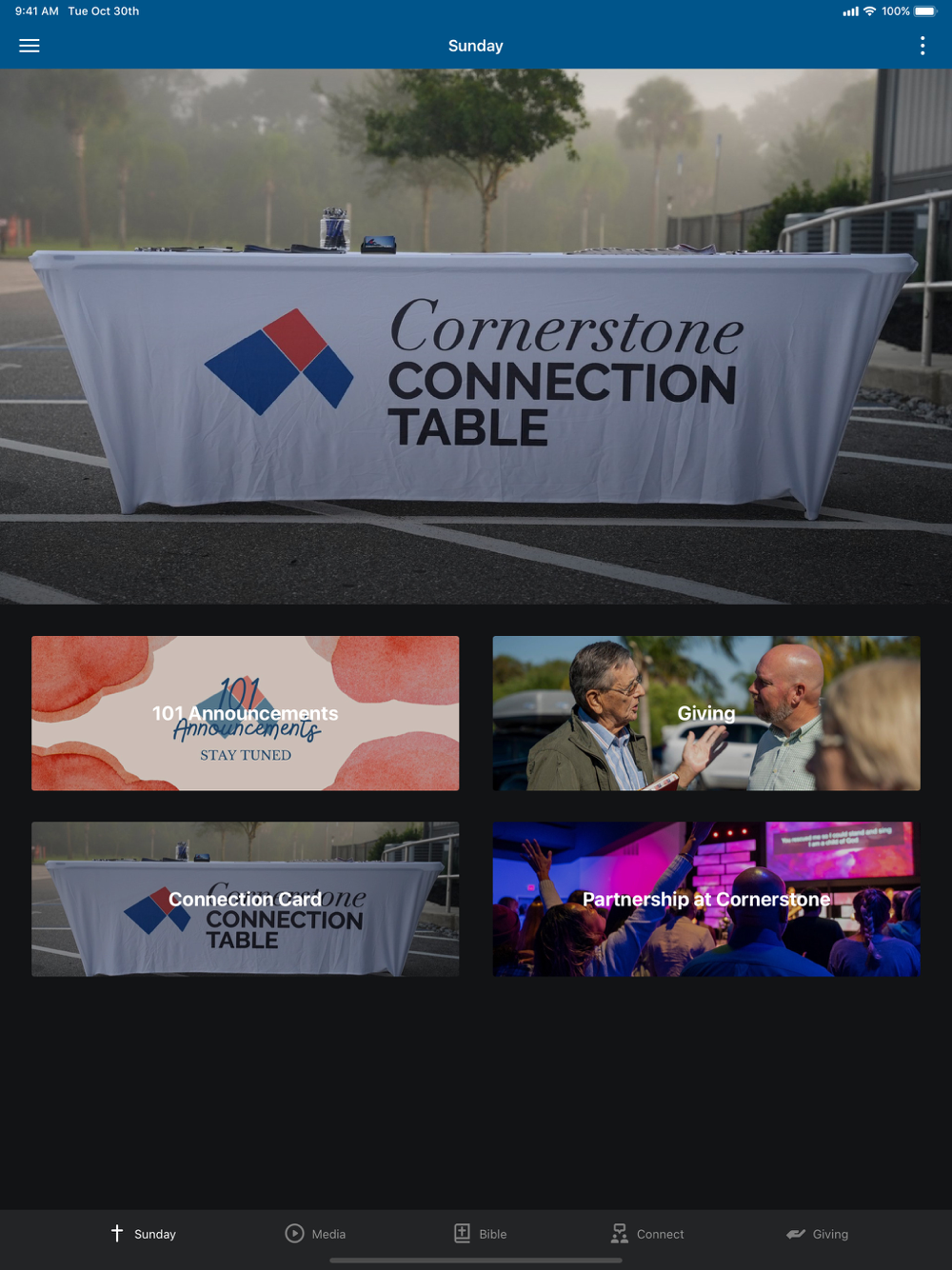 This app will help you stay connected with the day-to-day life of Cornerstone Church. With this app you can: watch or listen to past messages; stay up to date with push notifications; share your favorite messages via Twitter, Facebook, or email; download messages for offline listening, and communicate with other members of your small groups or serving groups.
