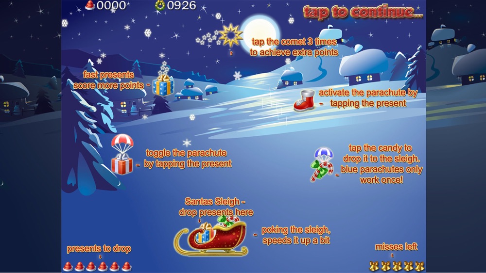 You can activate/deactivate the parachute by tapping the presents. Try to drop as many Christmas presents as possible to Santa's Sleigh.