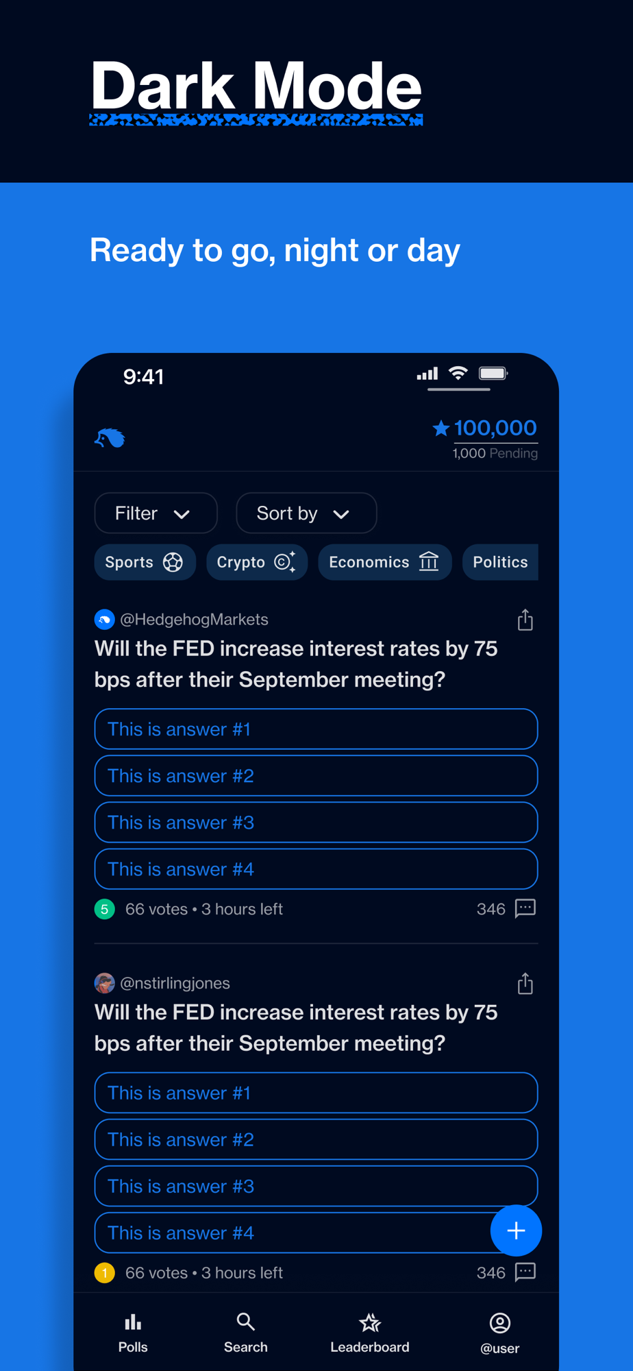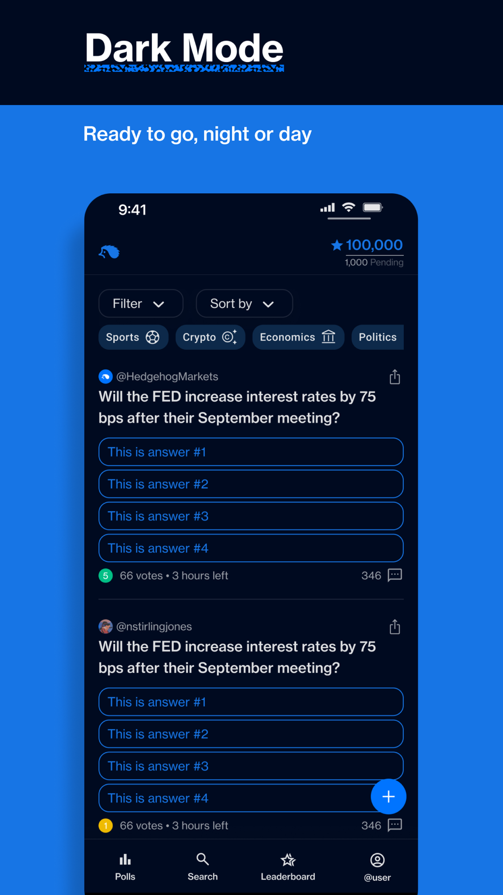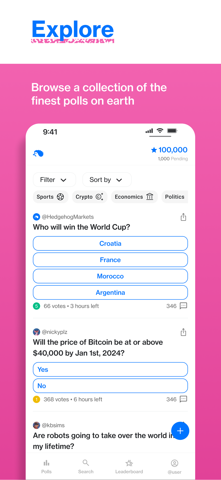 Hedgehog Polls lets you join in on predicting real world events through the power of crowdsourcing users' choices all over the world. You can create a poll, respond to polls and even comment on polls to share your thoughts and earn points along the way! You can predict sports outcomes with a single tap and earn points for selecting the correct outcome. Hedgehog Polls covers various sports including NFL, NBA, MLB, MLS, NCAA, March Madness, Super Bowl, NHL and many more. Polls can be created on any topic - even what color shoes you should wear today. Place predictions on financial outcomes like future prices of stocks, FOMC interest rate decisions, and NFT floor prices or find markets about what the weather will be like in Chicago next week. Place predictions on anything with our unique prediction market polls platform!