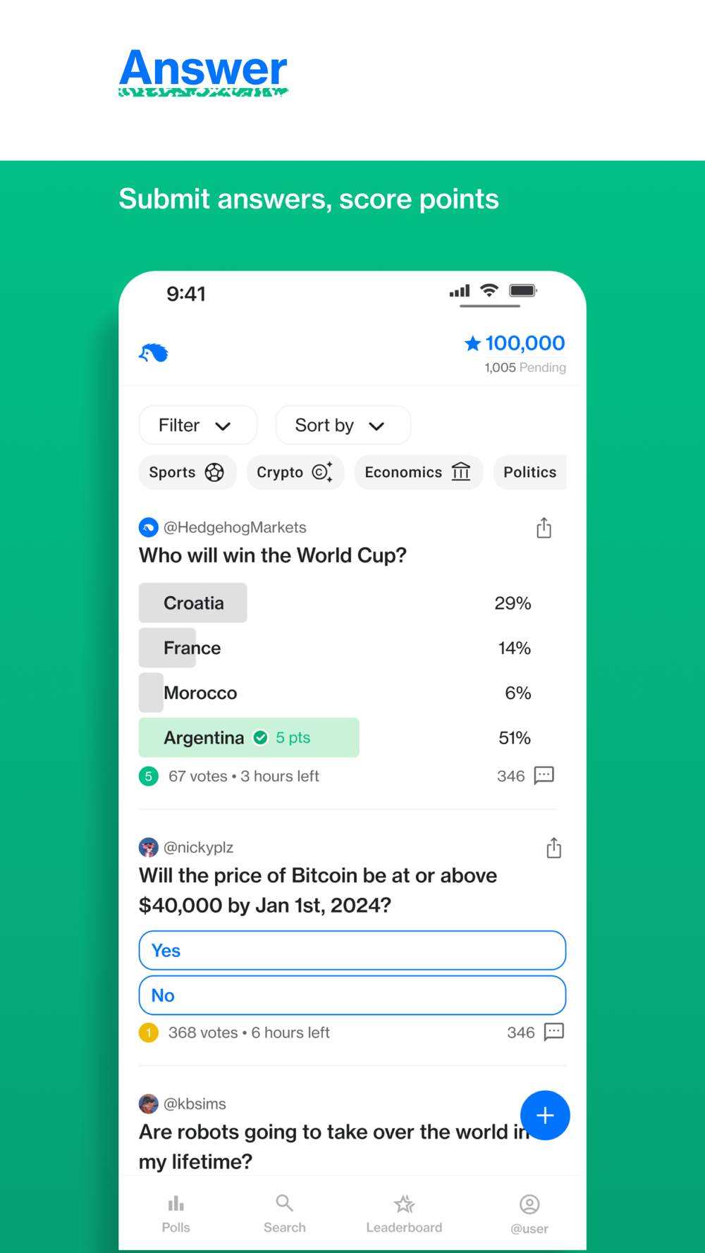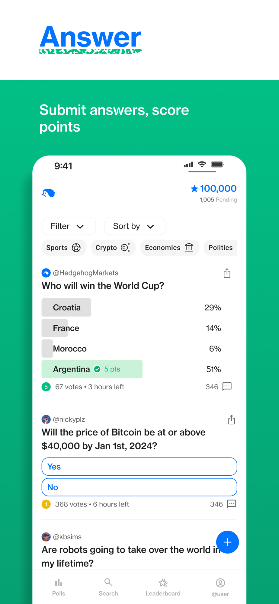 Hedgehog Polls allows you to create and participate prediction markets on anything. Place predictions and respond to polls about any event or topic. Create your own polls or answer others' to earn points! How high can you climb on the leaderboard?