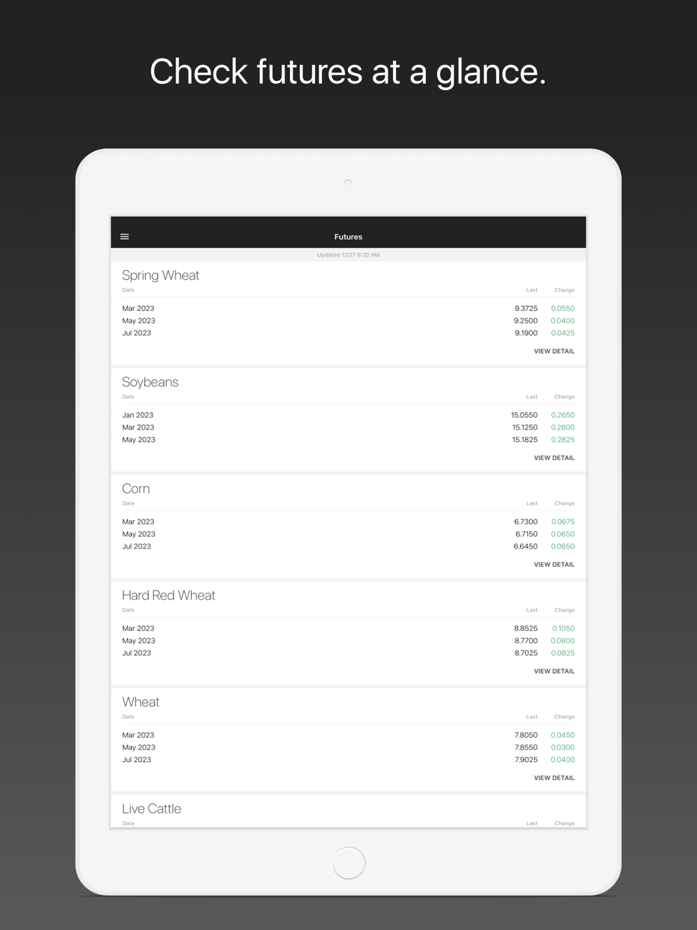Futures: See Grains, Feed, Livestock, and Ethanol futures listed in order of your preference