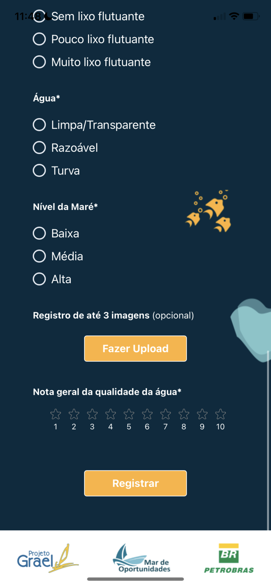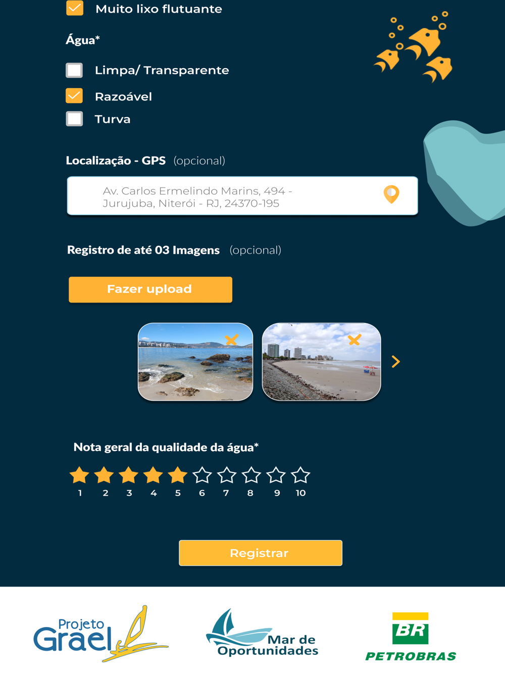 Você pode fazer o registro de onde estiver, multiplicar a ideia de cuidado com o meio ambiente e assim contribuir para a preservação ambiental. Vamos construir um banco de dados consistente e atualizado sobre a Baía de Guanabara que pode ser utilizado para fins educacionais e de pesquisa, podendo ser utilizado por educadores dentro e fora da sala de aula, pescadores, banhistas, atletas náuticos e por todos que usufruem da Baía de Guanabara.