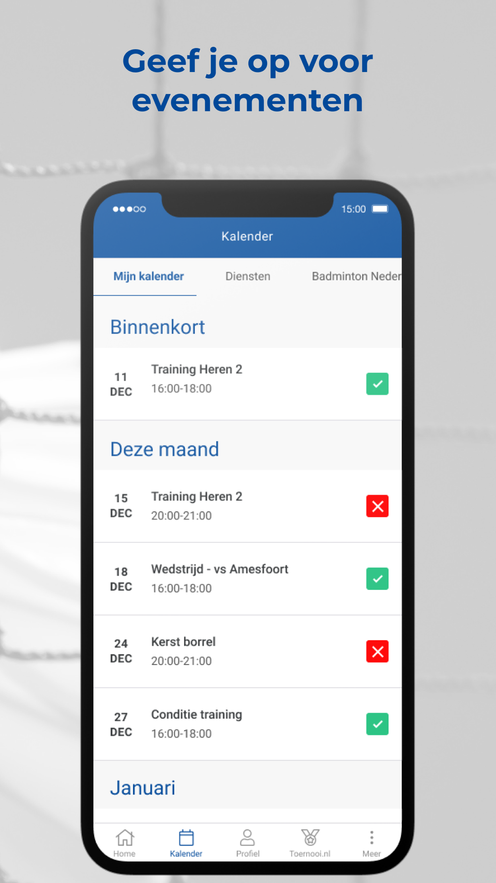 - Geef jouw aanwezigheid door voor wedstrijden, trainingen en evenementen
