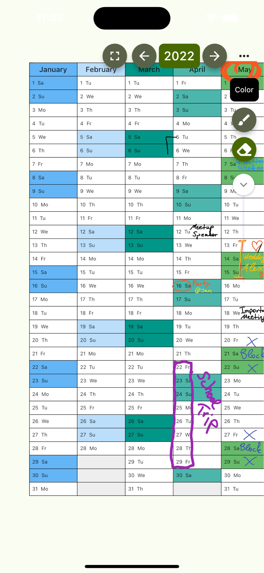 With this app you can easily draw on the calendar. Just choose your color and start drawing your appointments for this, next or whenever.