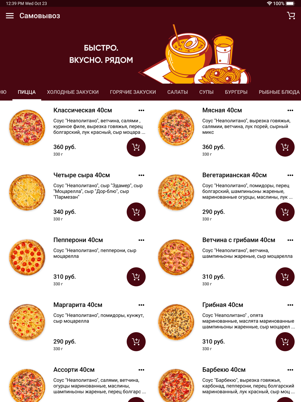 В меню: пицца, бургеры, закуски, горячие блюда, блюда на компанию.