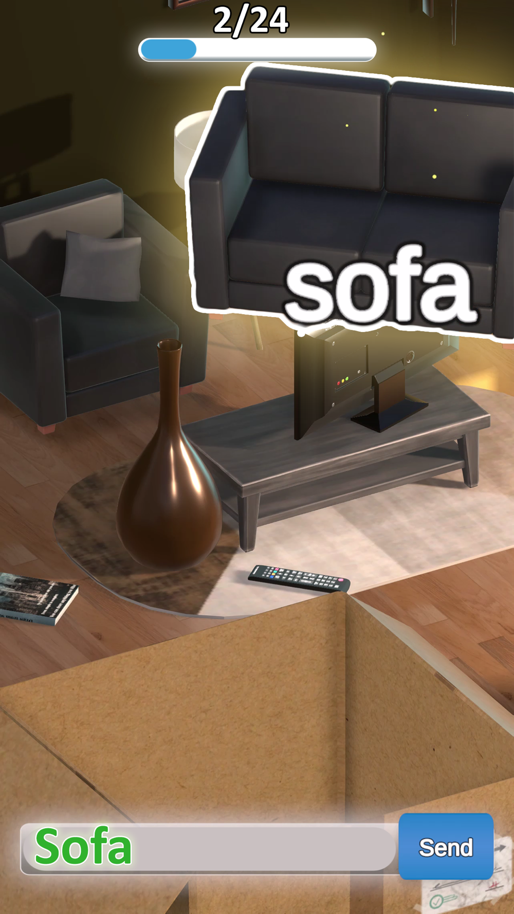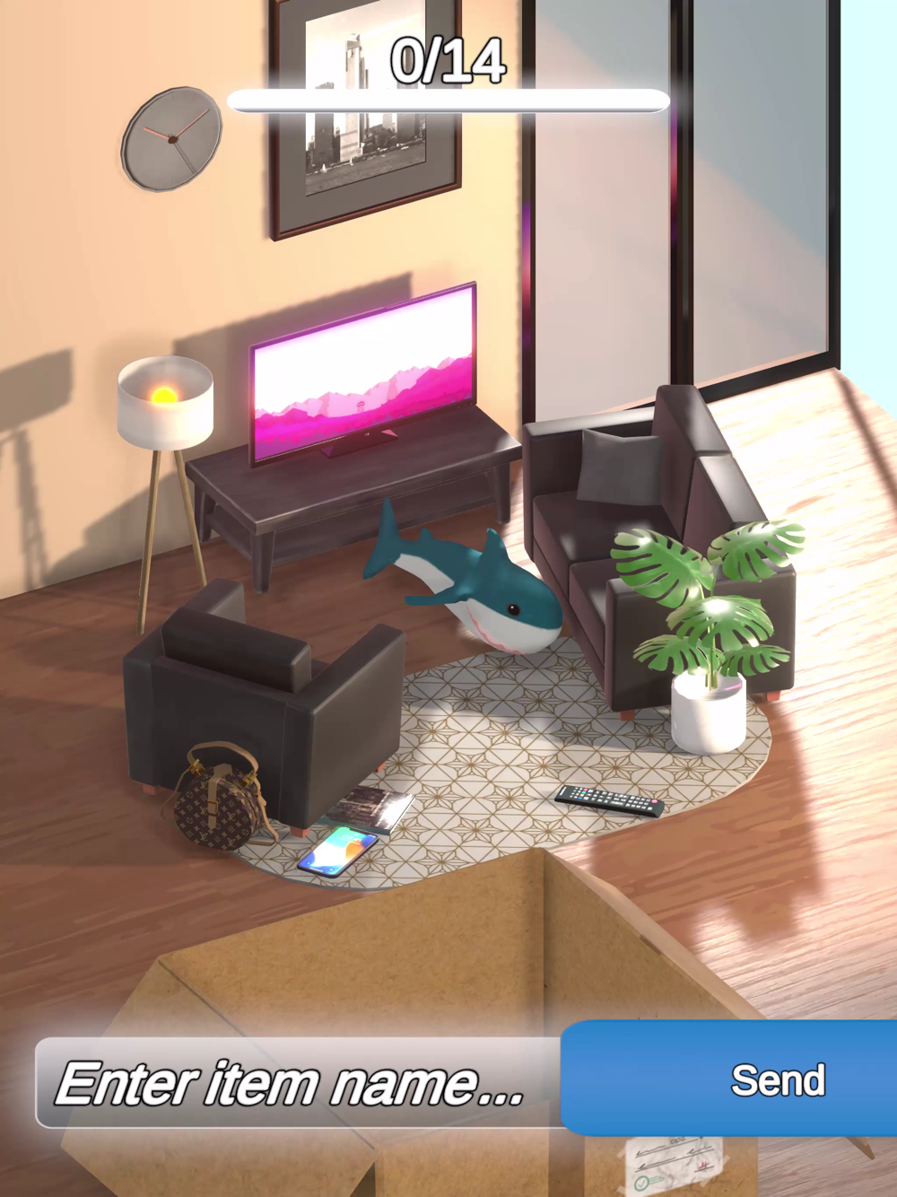 Go through the levels by writing down the names of objects. Stack everything. items in the box, clear the room. Write down all the items you find