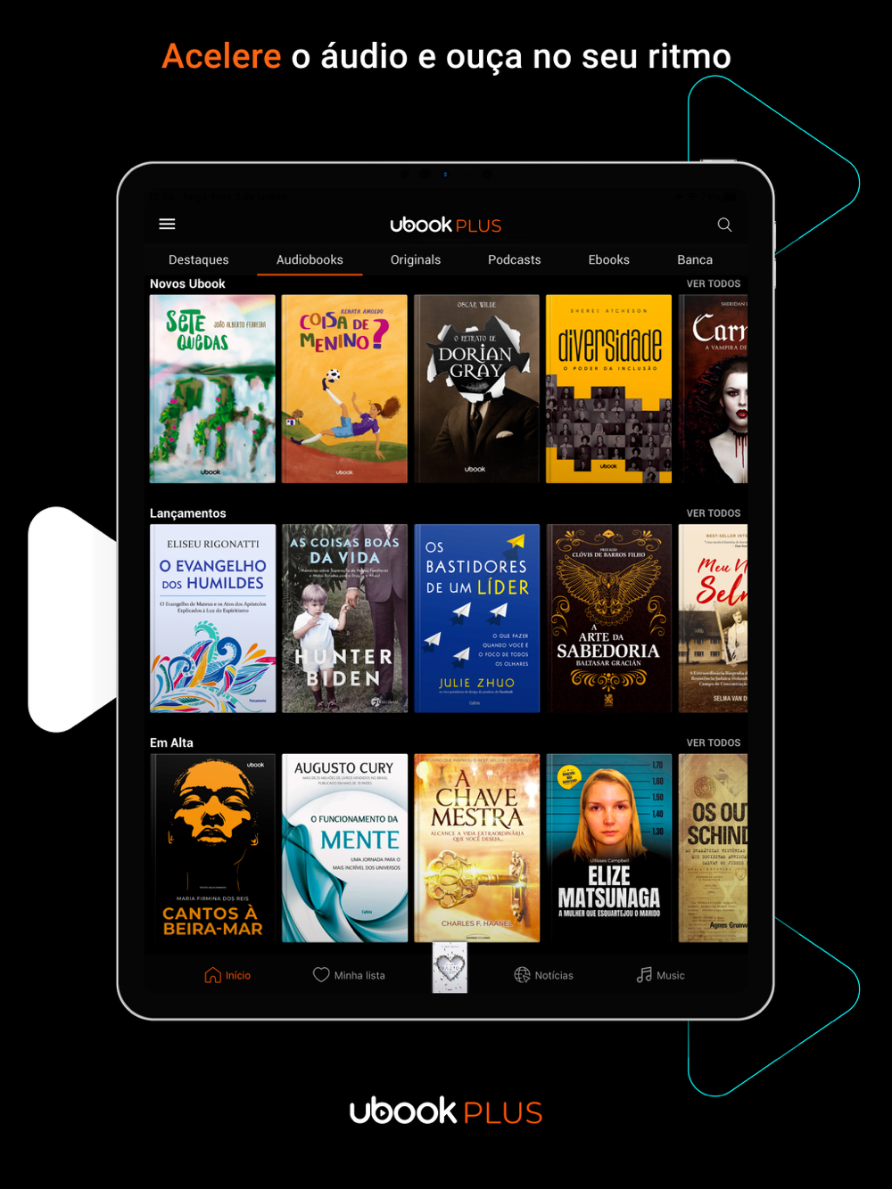 Para deixar sua experiência ainda mais completa, a seção de News te informa as principais notícias do Brasil e do mundo em tempo real. Já a Ubook Music conta com uma rádio, a Ubook FM, 80 playlists de todos os gêneros, criadas pela nossa curadoria, para embalar os seus momentos!