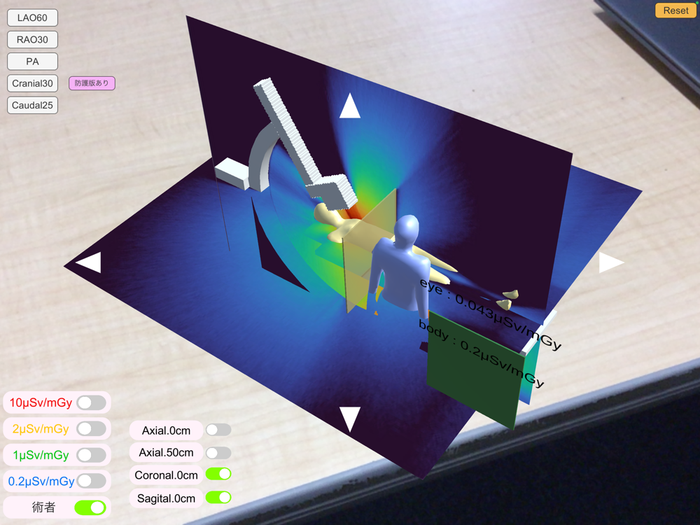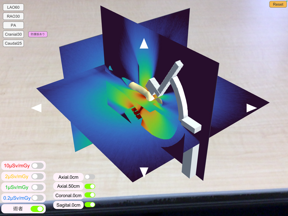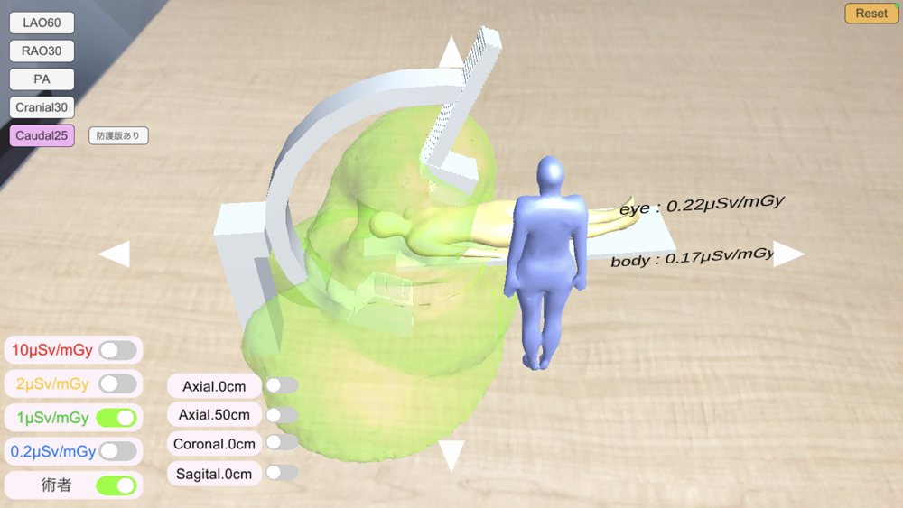 IVRでの散乱線をARにより可視化します。複数のCアーム角度、防護板の有無、オブジェクトの拡大縮小に対応しています。