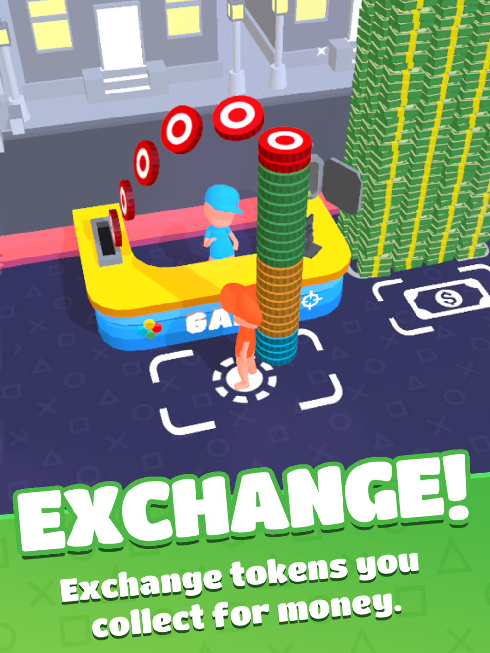 Collect tokens left by players from the ground! Convert tokens into cash at the cashier. Open new playgrounds and gain more customers!