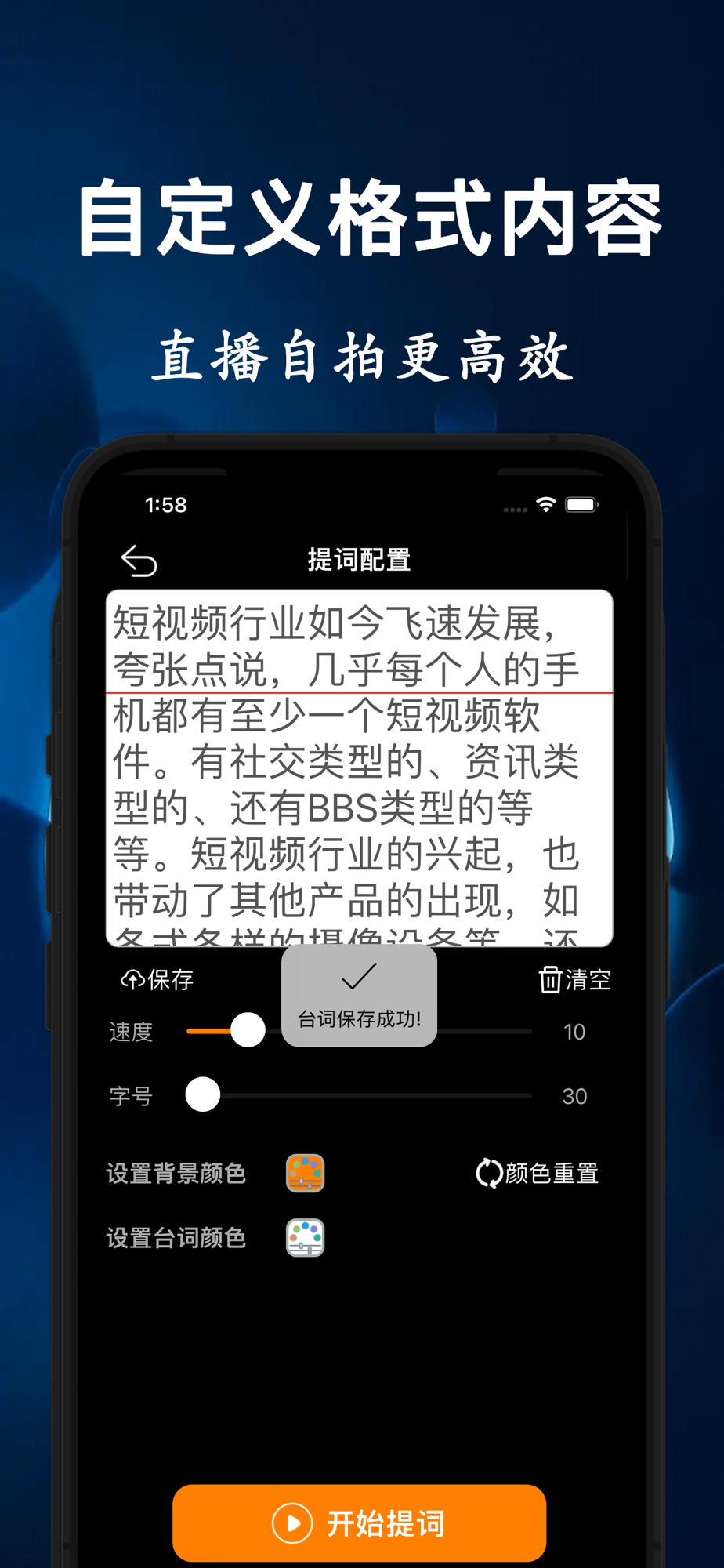 可以根据需要调节大小、提词速度、背景颜色、提词颜色。