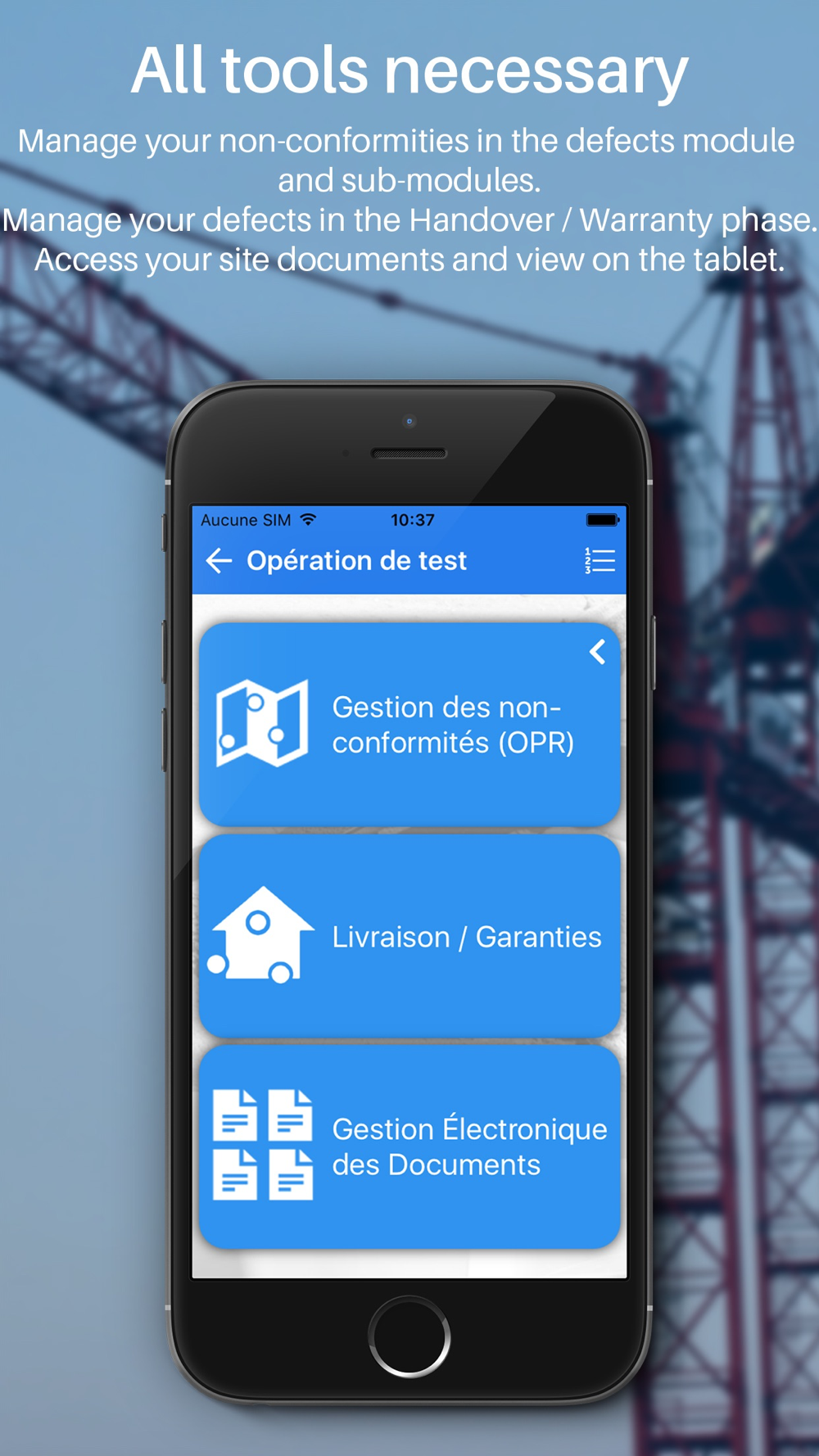 => Create, manage and correct your defect on site. On mobile or tablet, the application replaces the use of spreadsheets or paper.