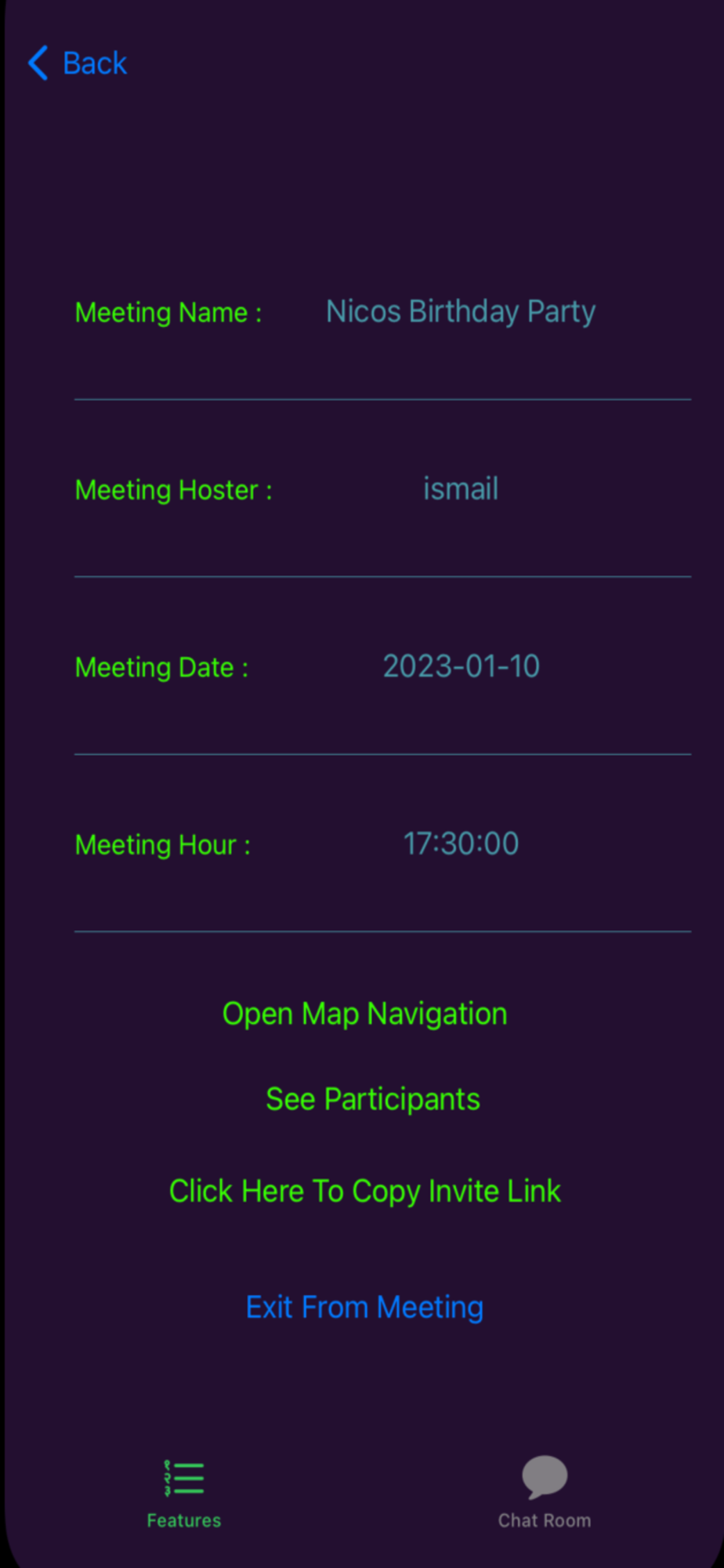 Create a meeting and organize it really easily. Send the meeting link to participants and chat with participants in a private chatroom of meeting. See all features of meeting like date, hour, participants and location. Go to location with special navigation inside app.