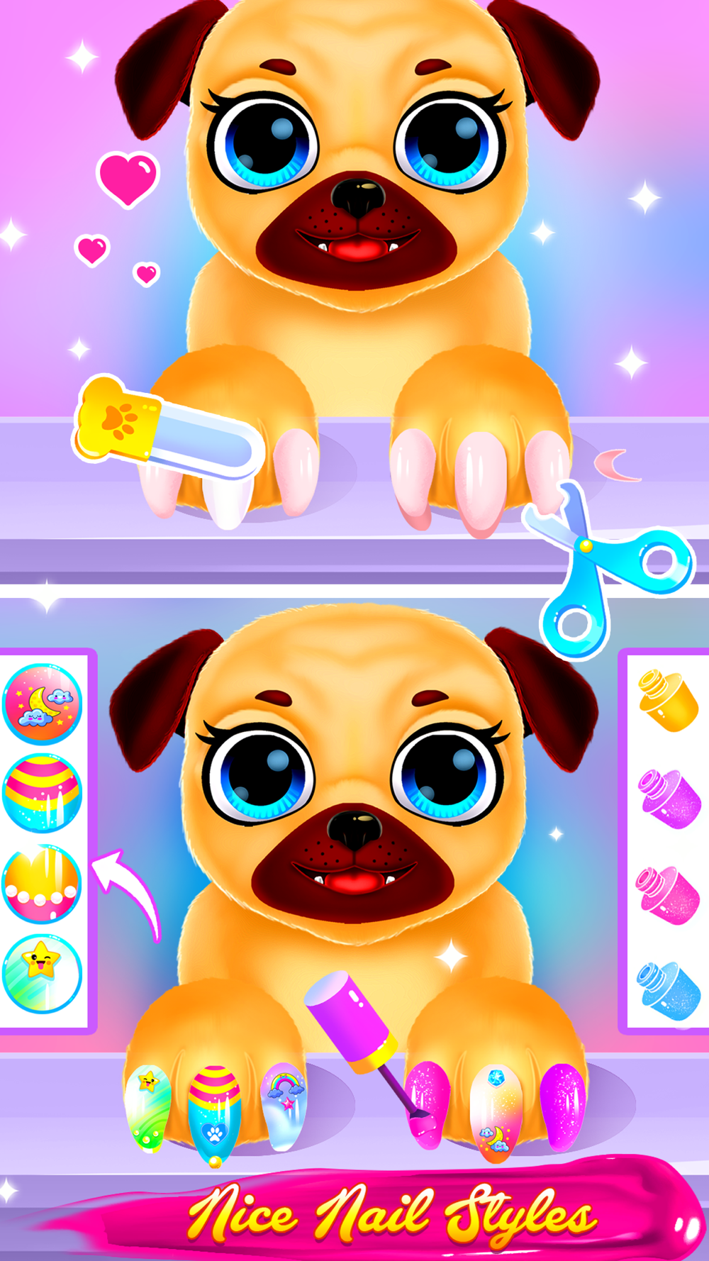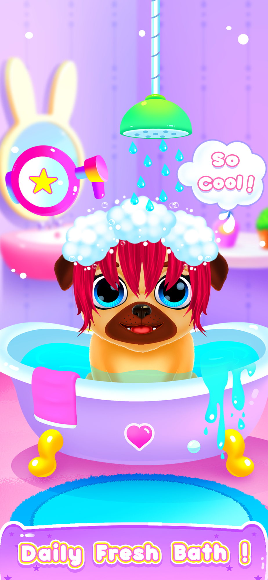 This cute little puppy is waiting to be petted and styled by you. You should start by going into the bathroom. Get the dog into the bathtub and wash its hair with shampoo. Use the showerhead tool to rinse out all the bubbles. Put the bathrobe on and dry the hair with the blowdryer. Now it is time to give this nice puppy a total makeover. Choose from our wide range of hair dyes and don’t shy away from trying out bright and bold colors like pink, blue or purple. Cutting the hair short can be a drastic change, but if it is done properly can improve one’s appearance considerably. So, do not be afraid to try out shorter hair lengths. After you’re satisfied with the color go ahead and style the puppy’s hair: first, you should brush it, making sure to detangle all the stubborn knots. If you prefer a more simple look straighten the hair and put on some hair clips. If you want to go for a more sophisticated style choose the curling iron tool and get to work! You could also cut some bangs and layers to add volume to the hair. You can dye the bangs a different color from the rest of the hair. Next, go to the dressing room and tap on the dress icon. A lot of pretty outfits will pop up and you can try out as many as you like until you find the perfect one for your puppy. Then, tap the sunglasses icon and pick the pair of sunglasses that fits the outfit the most. Do not forget the earrings and hat; they make outfits look so stylish. Top off the look with a lovely red or pink collar. Go to the nail salon and put the dog’s paws on the table. Clip them and file them. Apply a vibrant nail polish shade and do not forget to apply stencils. Whether you pick the moon and clouds design or the one with the waves, I am sure the nails will end up looking great. In the end, you should be left with an adorable stylish dog.